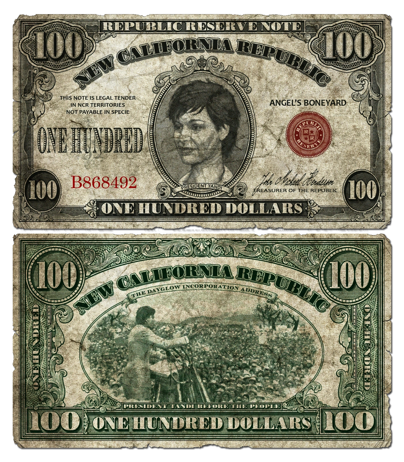 The New California Republic one hundred dollar bill is the largest denomination of the NCR dollar in Fallout: New Vegas, comparable to the Legion aureus and other large currency denominations.