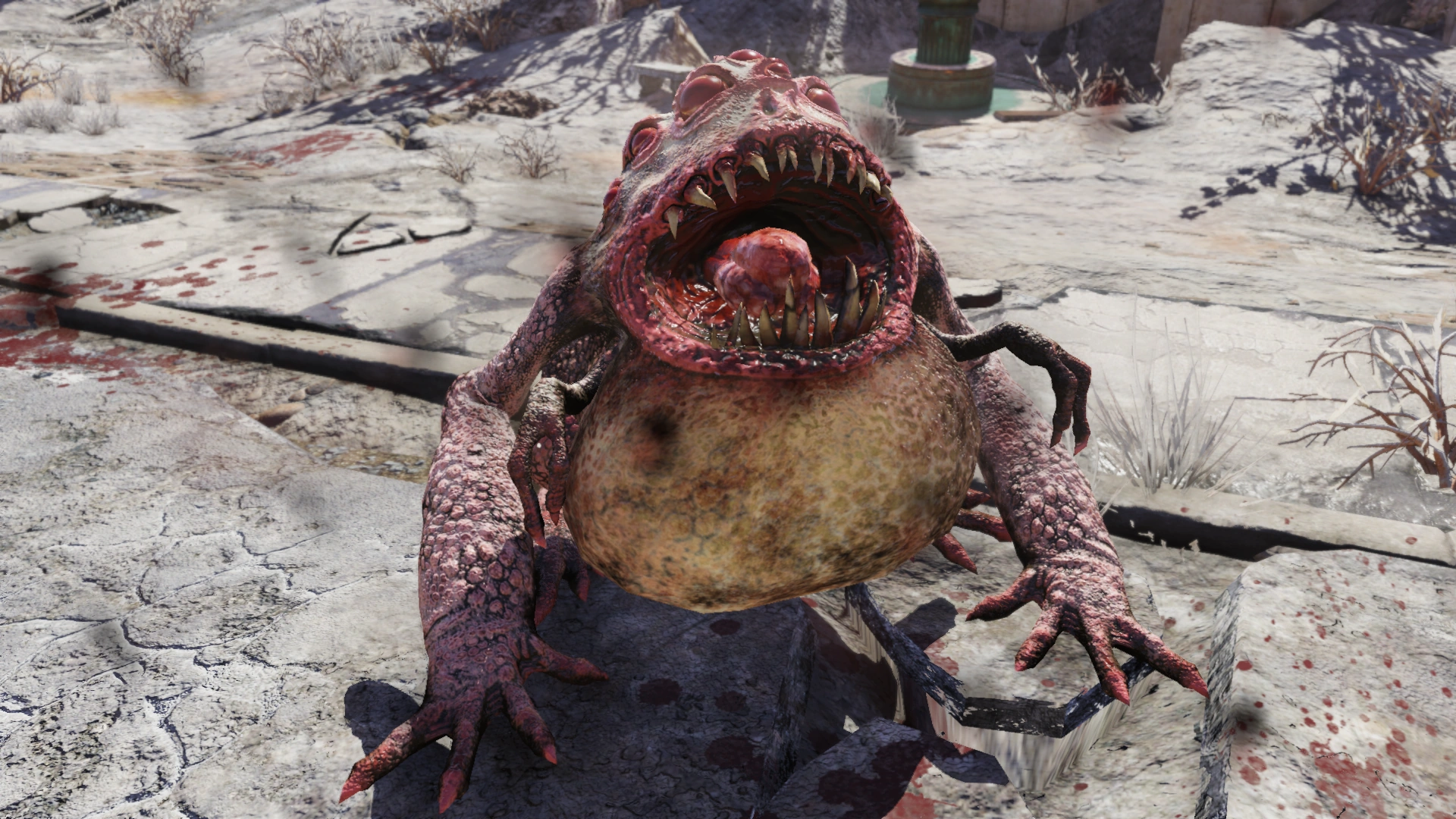 Twisted by the Appalachian nuclear fallout, the toads of West Virginia got big and vicious. Radtoads use their elongated tongues to ambush prey at a distance, with the multiple working eyes providing excellent peripheral vision. If attacked, they unleash clouds of poison gas from the twisted parotoid glands and send out swarms of their own offspring to harass opponents.<ref>Fallout 76 loading screen hints