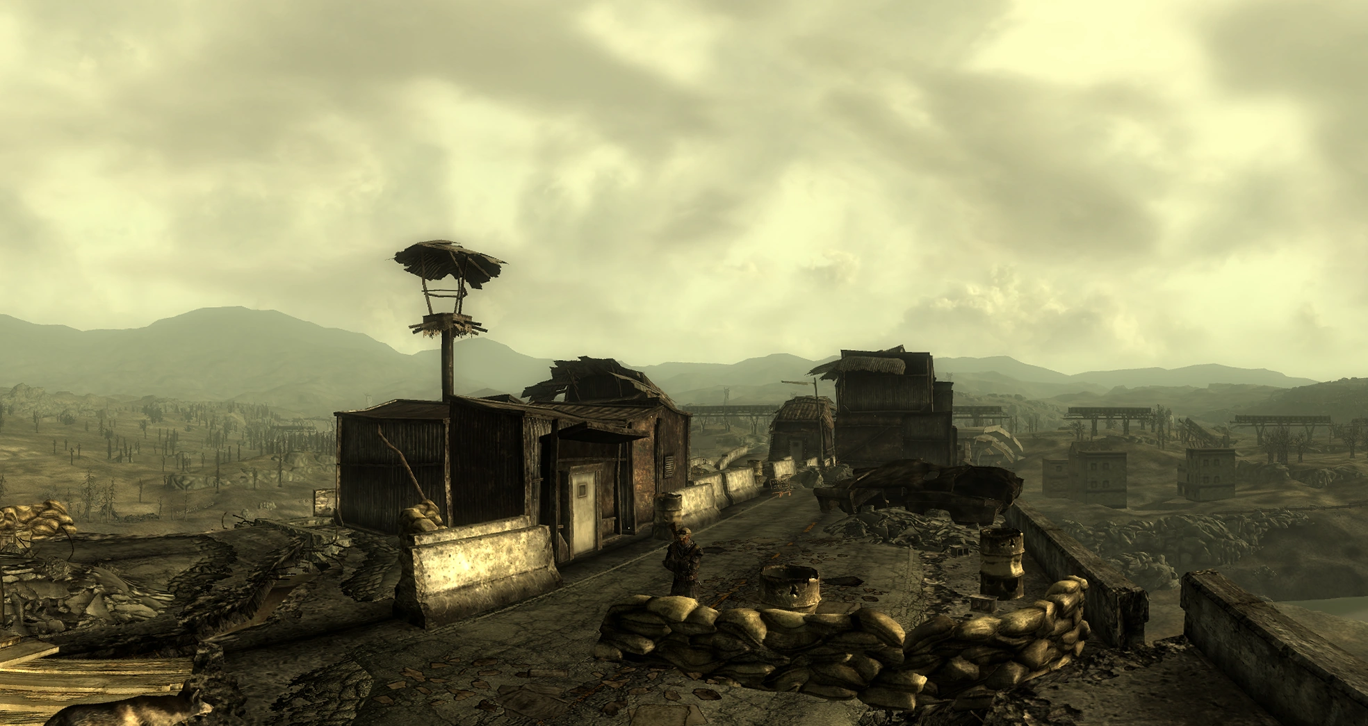 An Enclave outpost can be seen after the player completes The Waters of Life, on another section of the overpass, visible to a player looking out from the highest drop-off point. These soldiers can shoot at the player across the gap as well as be shot at themselves. However, the people in Arefu won't attempt to eliminate the outpost themselves.
