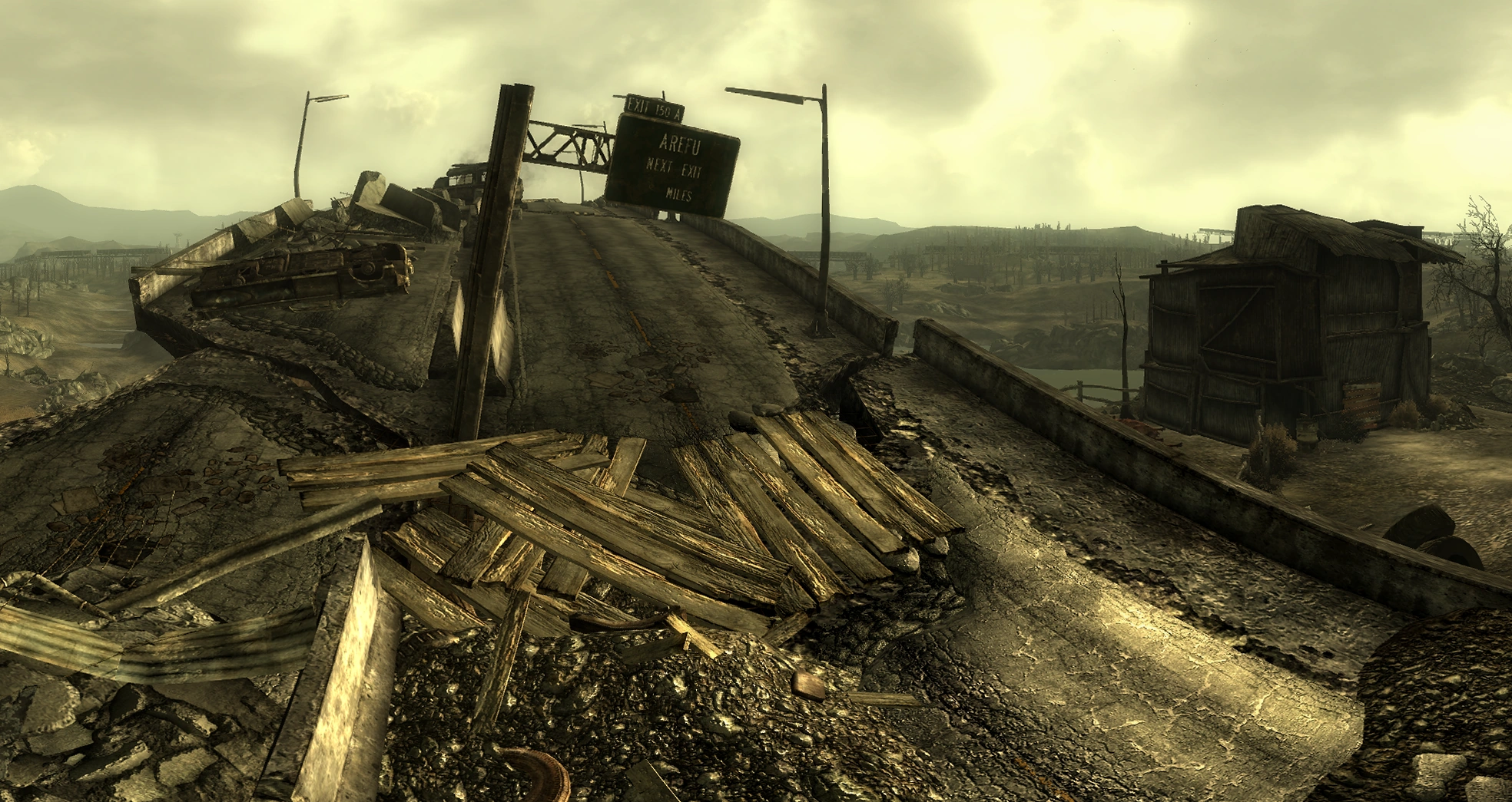 Arefu's four houses sit atop a defensible section of the remains a bridge. Part of the overpass has collapsed, making it impossible to enter the settlement from the north. It is one of the stopping points on the trader circuit, and sandbags are also deployed near its entrance to help the inhabitants fend off attackers.