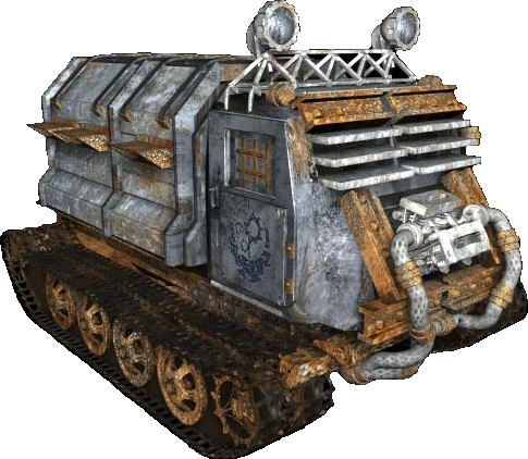 An original design from the Eastern Brotherhood of Steel, this variation of the armored personnel carrier acts as a heavily armored personnel transport. Twin tracks carry these vehicles over most terrain, and also provides for a very small turning circle. These vehicles are slow, so once they are caught out in the open, they become a sitting duck against heavy artillery.[1]