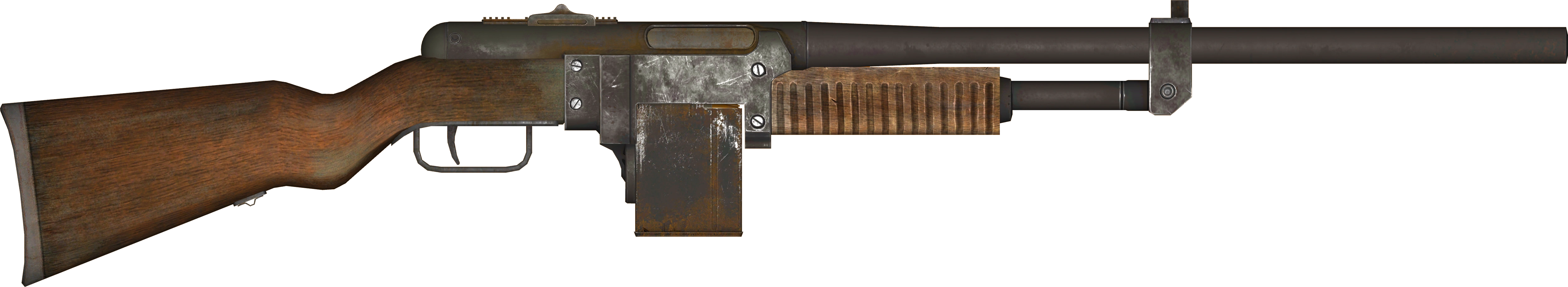 The battle rifle is a gas-operated, semi-automatic, clip-fed rifle chambered for the .308 round. In terms of operation, it is a relic of 20th century engineering, utilizing an "en bloc" clip system that allows ammunition to be inserted from above, clip included, into the fixed internal magazine. When all eight rounds are expended, the clip is ejected with a very distinct metallic "ping". Despite the archaic loading method, the combination of powerful rounds and semi-automatic fire makes it a viable choice for a post-nuclear combatant.