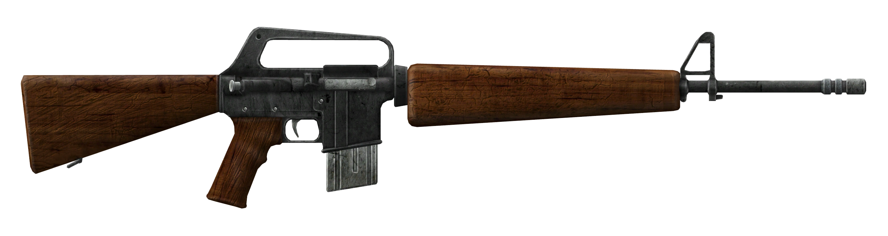 The New California Republic service rifle is a lightweight, air-cooled, magazine-fed, gas-operated rifle that uses the direct impingement gas principle with a rotary bolt locking mechanism.[5] It is typically loaded with 20 5.56mm rounds per magazine, giving NCR troopers good firepower in the field, despite the absence of automatic firing modes. The key here is its conventional layout, with excellent ergonomics, gas operation, and straight recoil combining to create a very accurate rifle, even in the hands of untrained conscripts. As a bonus, the full wood-and-metal rifle can be easily broken down for cleaning or replaced with a new unit manufactured by the Gun Runners.[6]