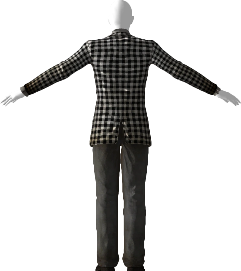 Benny's suit is comprised of a black and white buffalo plaid blazer and a pair of gray slacks with a travelers crease. A white, long-sleeved shirt is worn underneath with a long black tie around the collar and attached is a silver tie pin. A pair of black dress shoes and a white handkerchief in the blazer pocket completes the set. It adds an additional five points to Speech and Barter. It can be repaired with any type of businesswear.