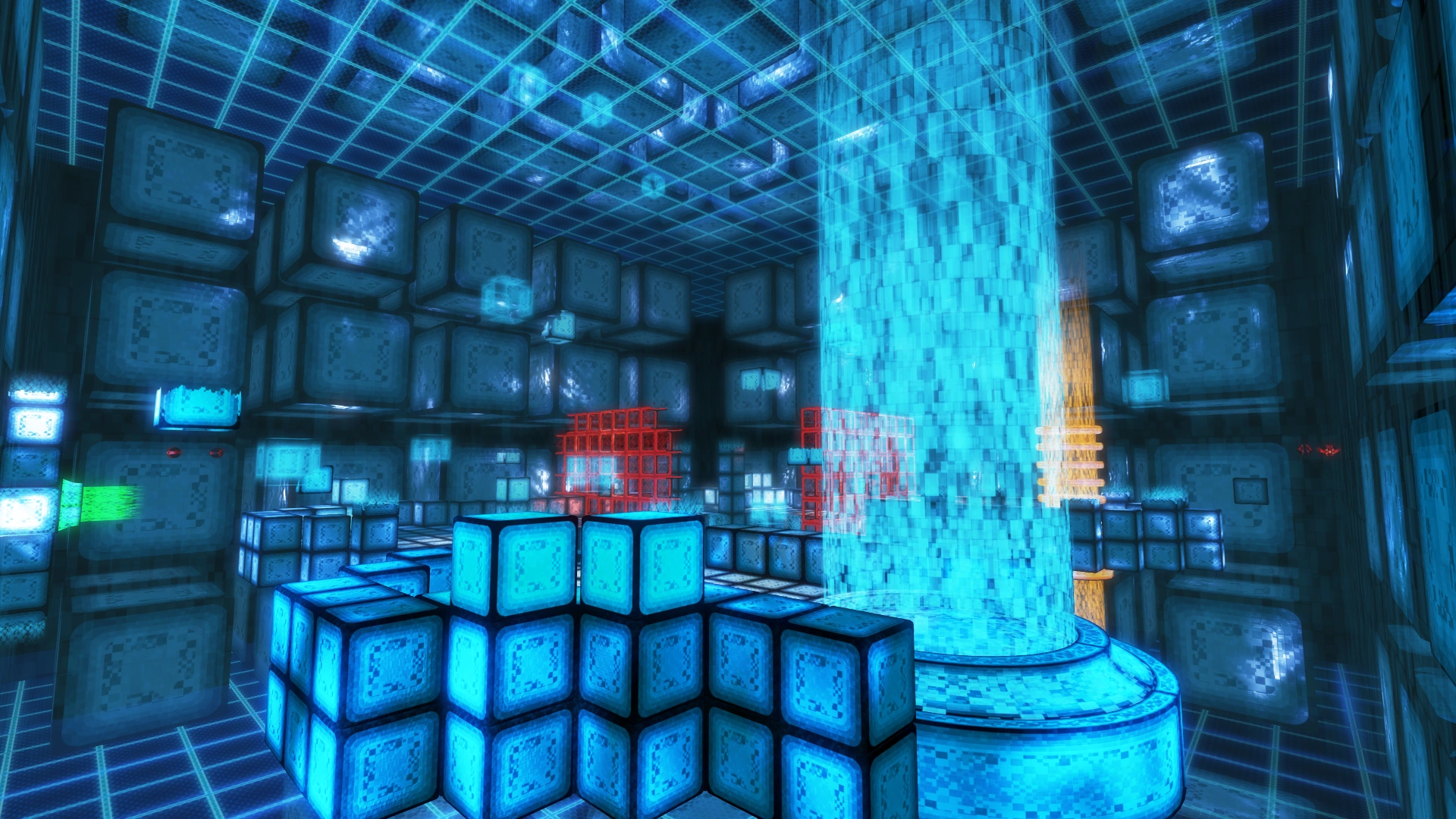 Enter the virtual reality. The rules are fairly simple: Destroy the firewalls using the green ray (aligned using the usable cubes with crystals inside, they redirect the laser), built a direct path to the orange column for your indexers (the little green worms, they are your best buddies), and defend them from sentry counter-measures using turrets. You get five turrets, but their range is very long, so place them with long fields of view. Don't bother picking up after yourself, the inventory is reset each time. To pass, you need five memory pieces to be retrieved.