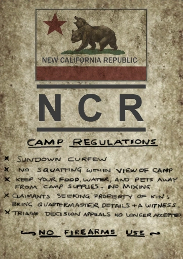 - The NCR flag will be upside down until the quest No, Not Much is completed. This is because the NCR uses it as a sign of distress,[5] like the United States Flag Code.