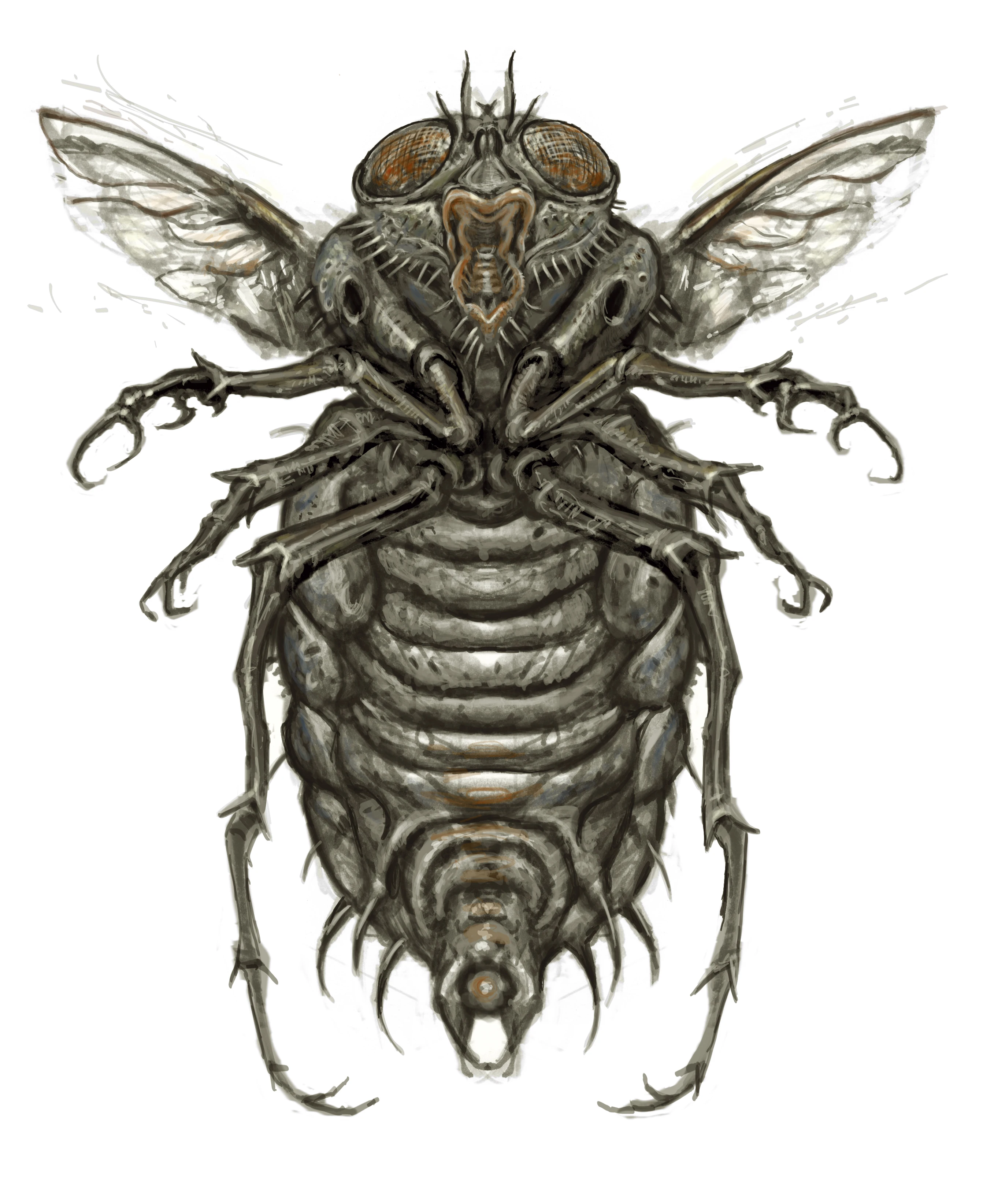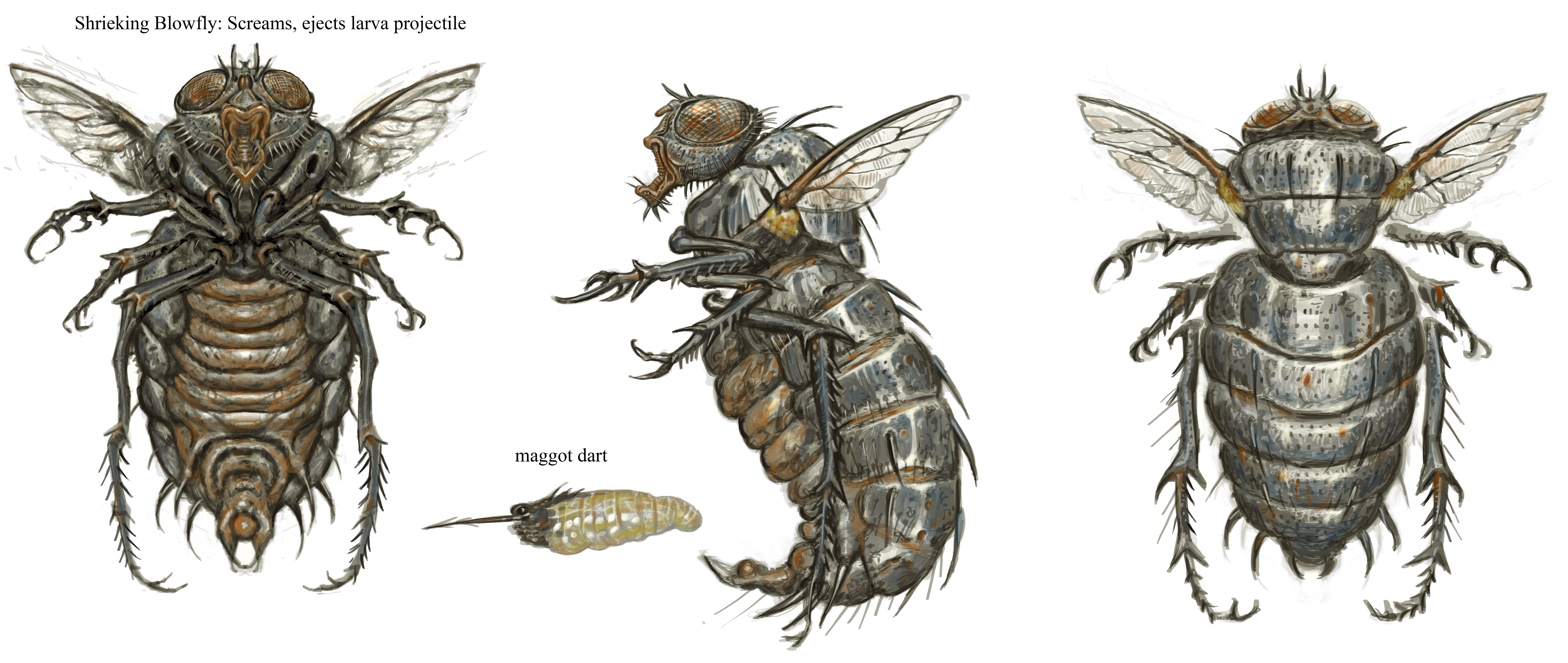Bloatflies are a common sight in the wastes, exhibiting strong territorial instincts and an absence of any sense of self-preservations. They usually travel in packs of two to four and attack other living targets relentlessly, using their larvae to try and paralyze them from afar. They are easily dispatched with any kind of weapon, however.