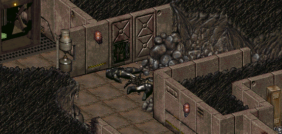 Sergeant Bracks post, checkpoint 3, was the first to be swarmed by the second generation super mutants during the Mariposa Military Base excavation.[1] His mangled body, in a destroyed suit of advanced power armor, now litters the collapsed corridors, his bones rattling inside.