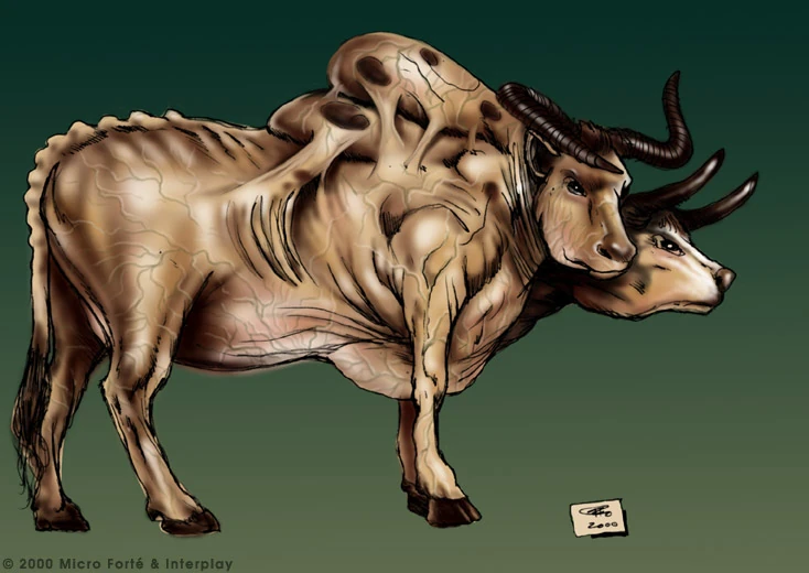 Brahmin are mutated cattle with two heads; in addition to twice as many heads, they also have eight stomach compartments,[6] males have four testicles,[7] and females have enlarged udders. They have lost much of their hair, leaving their skin a toasted brown, orange, or pink color, and attack by head-butting or trying to gore someone with their horns.