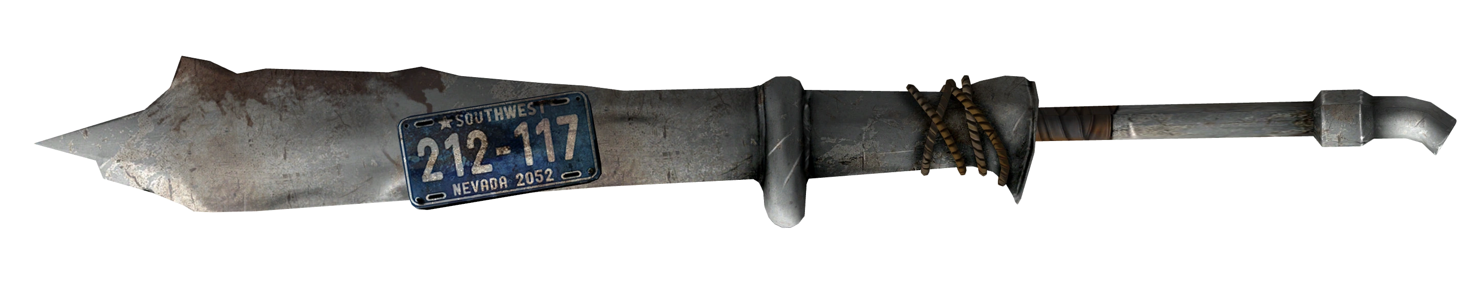 This two-handed melee weapon is made from scrap vehicle parts. An exhaust pipe forms the shaft, with the blade fashioned from a car bumper with the license plate still attached.