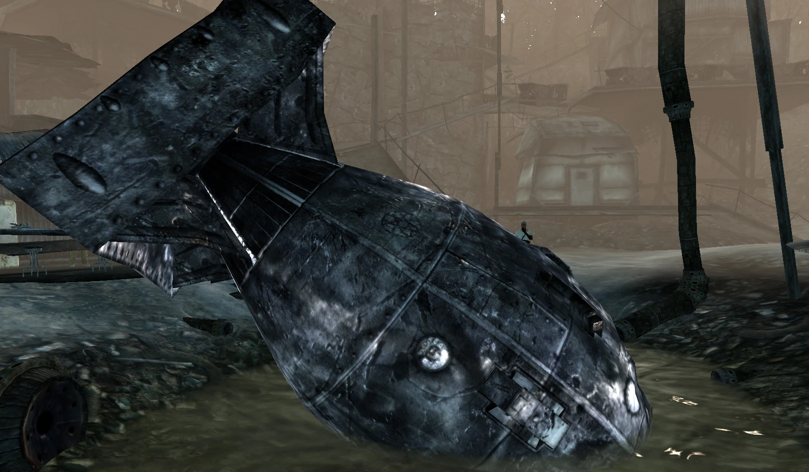The C-23 sits in the center of the town, surrounded by a shallow pool of irradiated water. It is used as a place of worship by Confessor Cromwell, who won't react either to rigging it with a fusion pulse charge or disarming the bomb. A copy of the weapon will also appear during the hallicunation sequence in Point Lookout's Sacred Bog, as the coda to the entire experience.