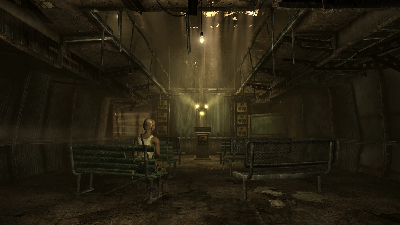 The history of the Children of Atom is tied closely to the history of Megaton. The founders of the religion were part of the refugees that took shelter in the crater in the 23rd century, worshipping the bomb that lay at its center.[2] As the crater was settled, the zealots aided in building the walls and clearing the wreckage to make way for the future town. The fledgling religion's only condition was that the holy bomb remained undisturbed. As it seemed to be a pile of harmless scrap, the town acquiesced.[3] The Children of Atom became a permanent element of the town and by the mid-2250s, the Confessor of the Church had enough clout to vouch for newcomers in Megaton. A young wastelander named Cromwell benefited from this and became a fervent adherent of the faith, eventually succeeding the Confessor. By 2277, the 44 -year-old Confessor Cromwell became an eccentric distraction to most of the citizens,[4] with church attendance steadily dwindling.[5]