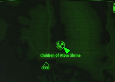As expected, this small building is bathed in Atom's glow, peaking at 28 rads per second in the pool of water on the east side; 5-20 rads per second is the average dose. A couple shrines are set up around the building, and a door on the southeast wall leads inside. Inside is a storage room and cage, locked up by the nearby terminal. There are clues situated around the room to aid in finding the password to unlock the cage.