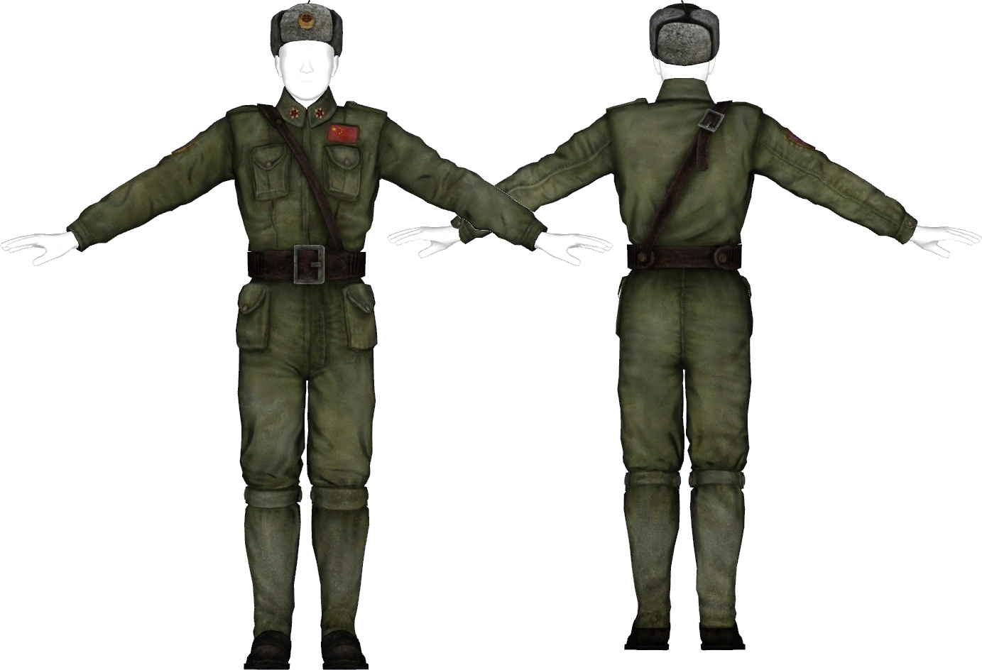 This olive jumpsuit provides a Damage Resistance of 6 and grants a bonus of +5 to Small Guns. It can only be repaired by copies of itself. The Chinese commando hat is lined with fur and bears the emblem of the People's Liberation Army. It provides a Damage Resistance of 1 and grants a +1 bonus to Perception.
