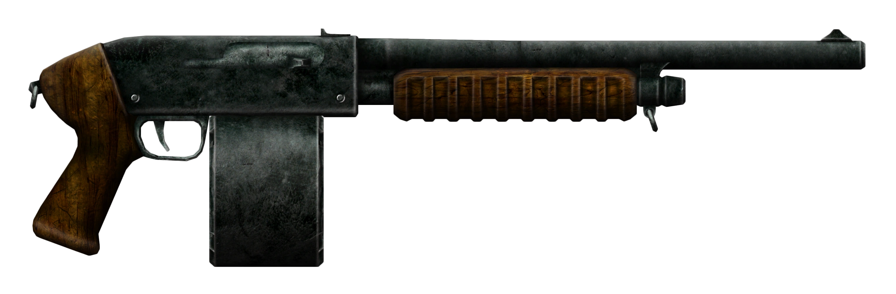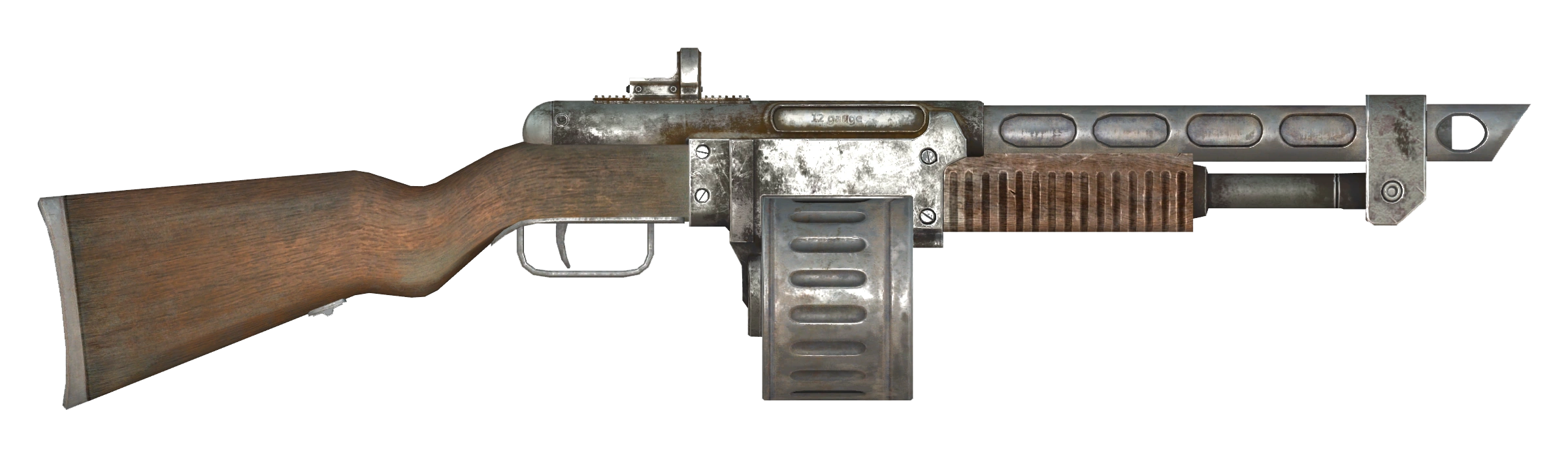 The combat shotgun was a weapon born out of necessity in a world ravaged by war and resource shortages. Instead of lightweight metal alloys used in eg. the Citykiller, it uses wood and stamped metal sheets that greatly reduce manufacturing costs, while its design maximizes durability without sacrificing the firepower provided by standard 12 gauge shotgun shells. Although it might have seemed antiquated, the combination of firepower, ruggedness, and low price tag resulted in widespread adoption by the United States military.[2] Though early models used a combination drum-and-tube magazine (when placed in the magazine well, the drum would fill the tube with shells), standardized, mass-produced versions used a more conventional magazine placement with a variety of magazine types available.[3]