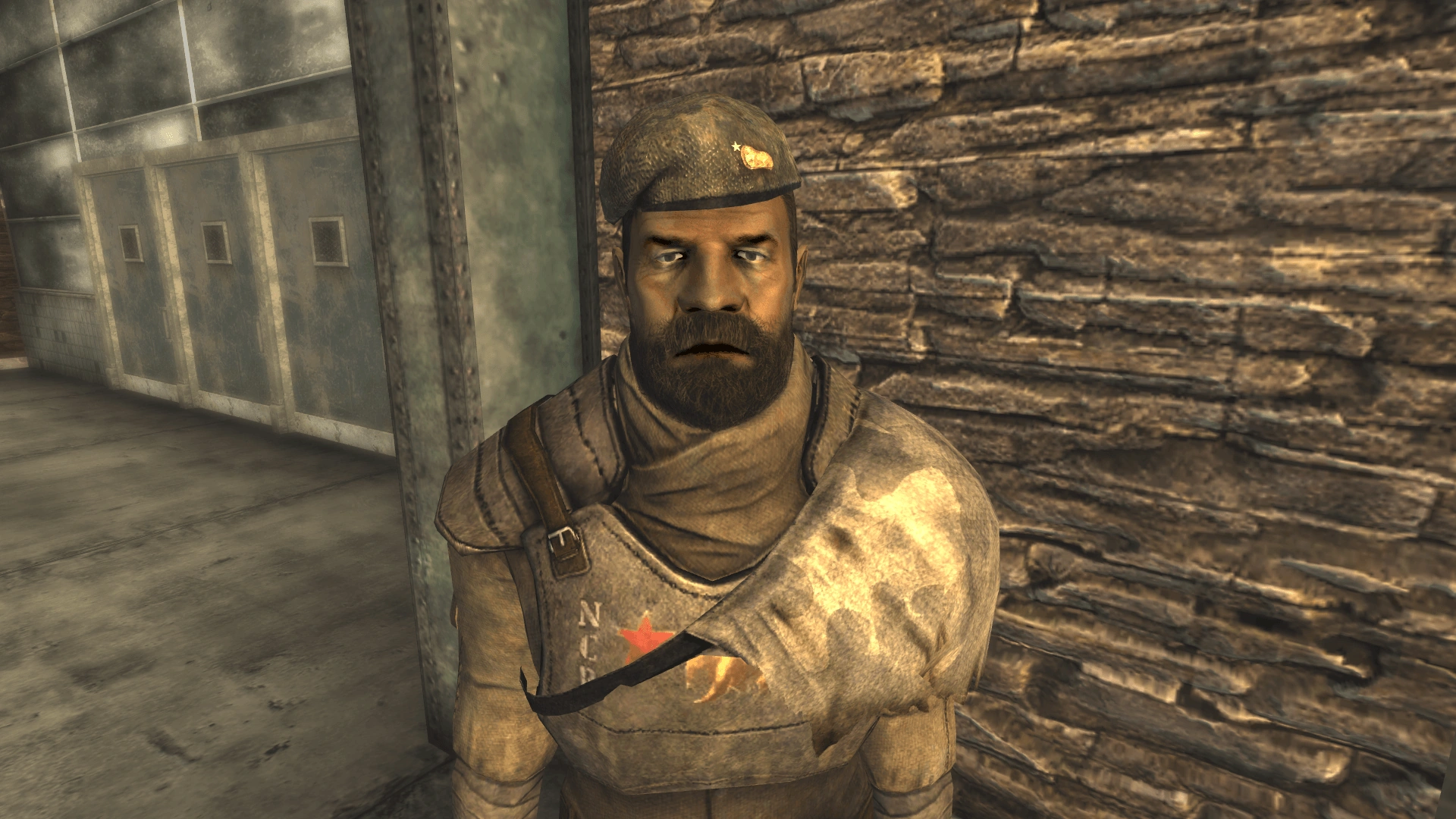 A veteran of the New California Republic Army, Dhatri holds the rank of Major. He is the officer in charge of troops stationed at McCarran, but currently has one thing on his mind: the bounty hunt for leaders of the Fiends, Violet, Cook Cook and Driver Nephi. He shares a particular kind of hate for the three, as they are responsible for the deaths of over twenty NCR troopers serving under his command.[2] He manages the bounties due to patriotism - otherwise, no amount of money would convince him to pick a fight with those Fiends.[3]