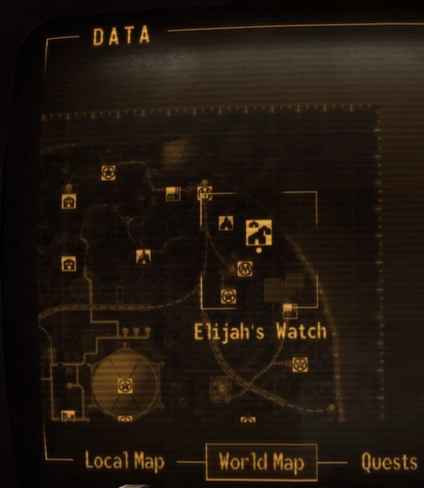 Elijah's Watch is located northwest of the Securitron de-construction plant and northeast of the mysterious cave. It is most easily accessed by starting at the de-construction plant. Behind the plant is an overturned military truck with several metal boxes, footlockers, and other containers strewn around it. From this truck, a trail of drained energy and microfusion cells leads directly to the camp via the only approach not protected by turrets.