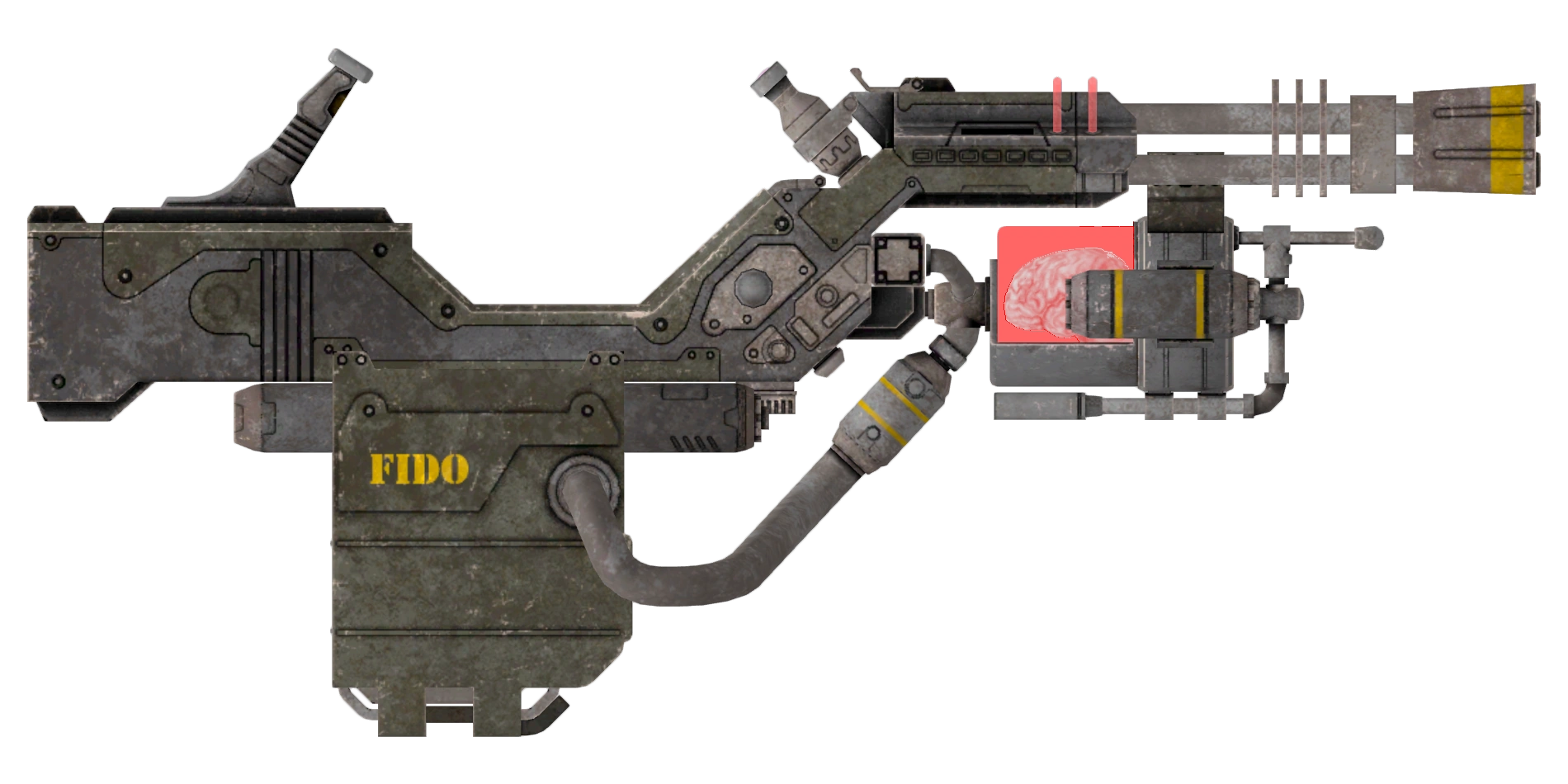 FIDO is an upgraded K9000 cyberdog gun. Unlike the the K9000 however, FIDO uses .44 Magnum rounds instead of .357 Magnum rounds, resulting in higher damage and a slightly higher spread. The brain case and the scope are red instead of blue-green and the decal is changed from a golden retriever to a bulldog. Other features of the K9000 cyberdog gun are included in FIDO.
