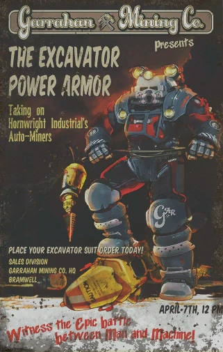 - Excavator power armor: The flagship project of the company and an attempt to redefine the future of Appalachian mining. Scrapped after the marginal, but nonetheless devastating loss to Hornwright in the Man vs. Machine contest.