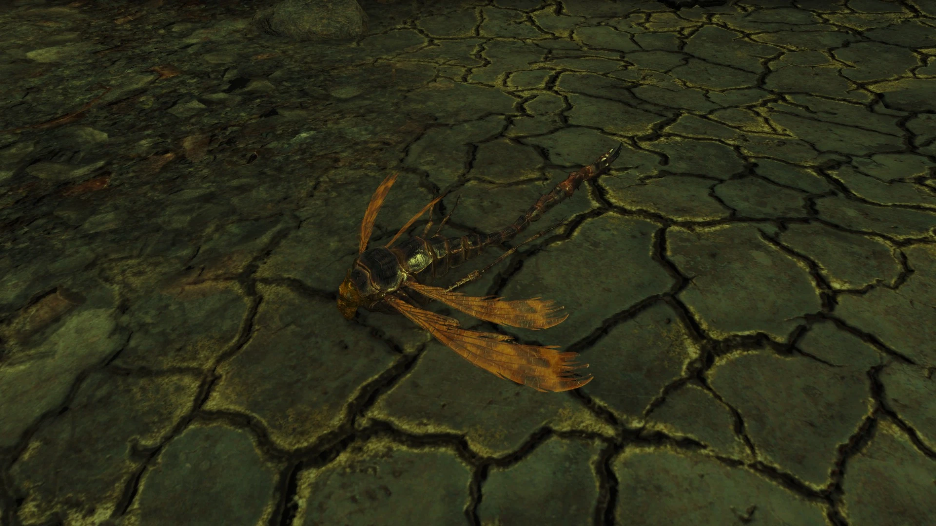A dead Stingwing Skimmer atop cracked earth.