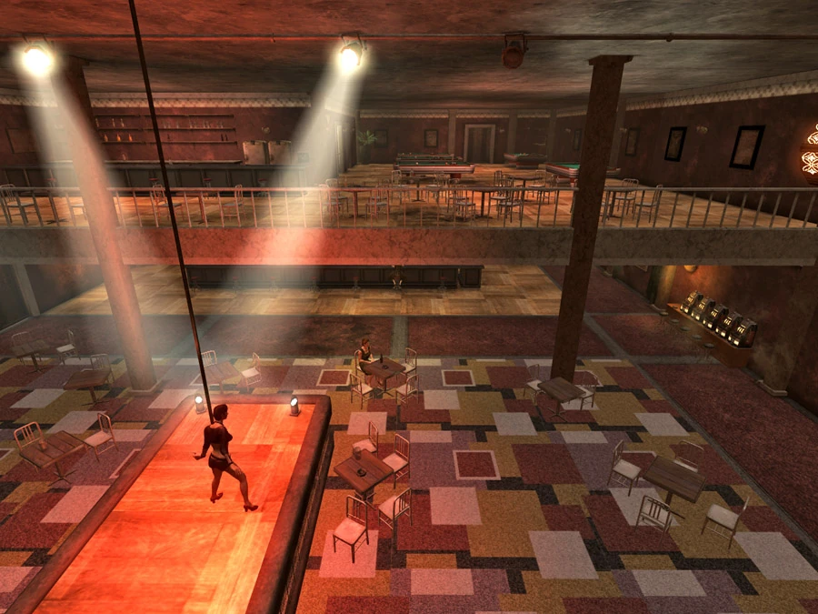 This club houses a bar, a listless dancer on a stage, and not much else. Cachino, a major player in the How Little We Know quest, can usually be found in the Brimstone main level during normal hours. At night he sometimes returns to his room on the suites level.