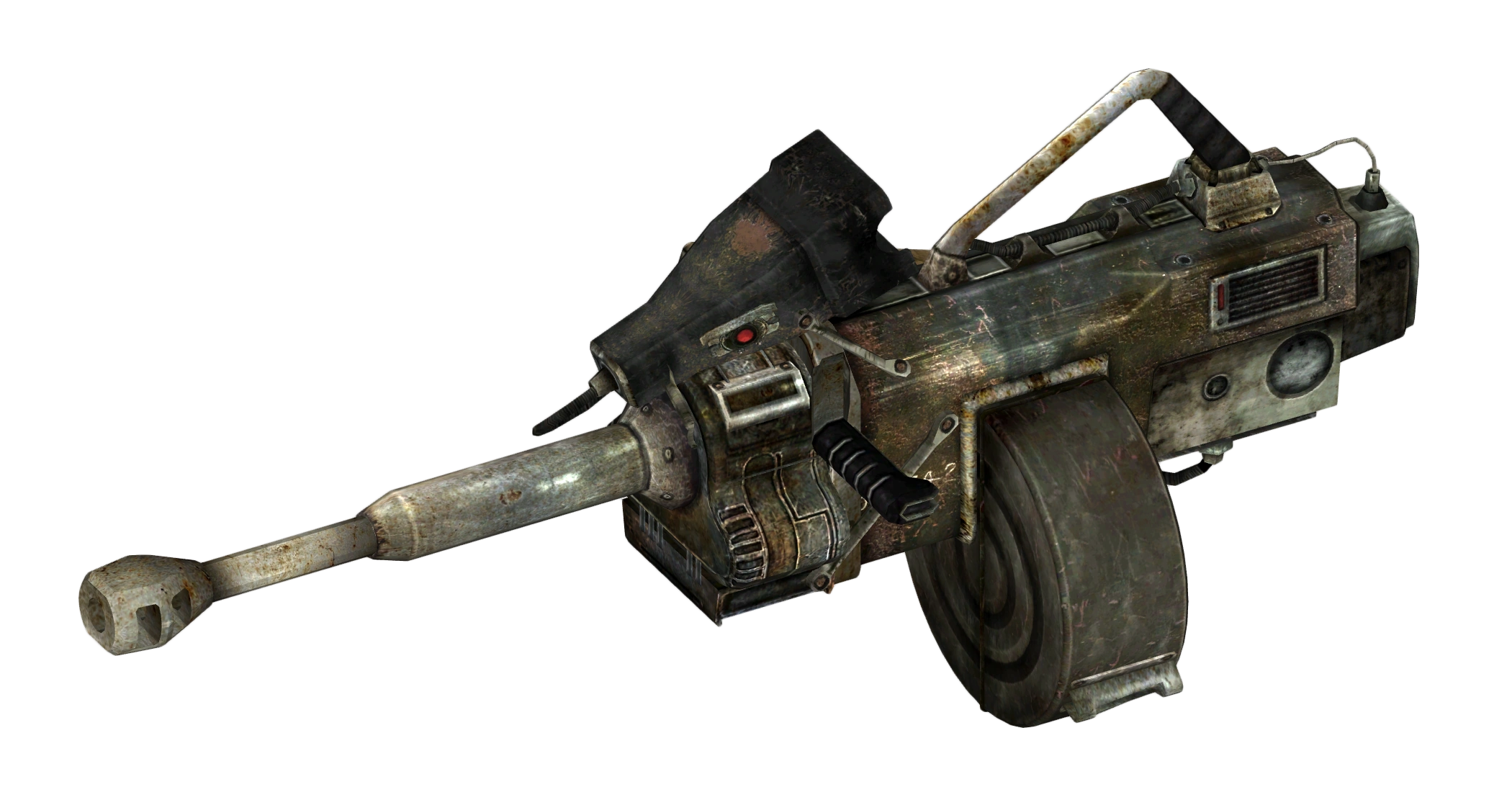 The automatic grenade launcher, sometimes referred to as a grenade machinegun, is a belt-fed, blowback-operated, air-cooled automatic weapon designed to lay down a heavy volume of explosive ordnance and support infantry and vehicle operations. Designed for use as a crew-served weapon, the automatic grenade launcher was intended for use against a variety of targets ranging from infantry and light vehicles to fortifications and other materiel. The sheer weight of the weapon and bulk of the ammunition limited its versatility, until the advent of power armor. Since then, many units were converted for use on foot, rather than from a tripod.[3]