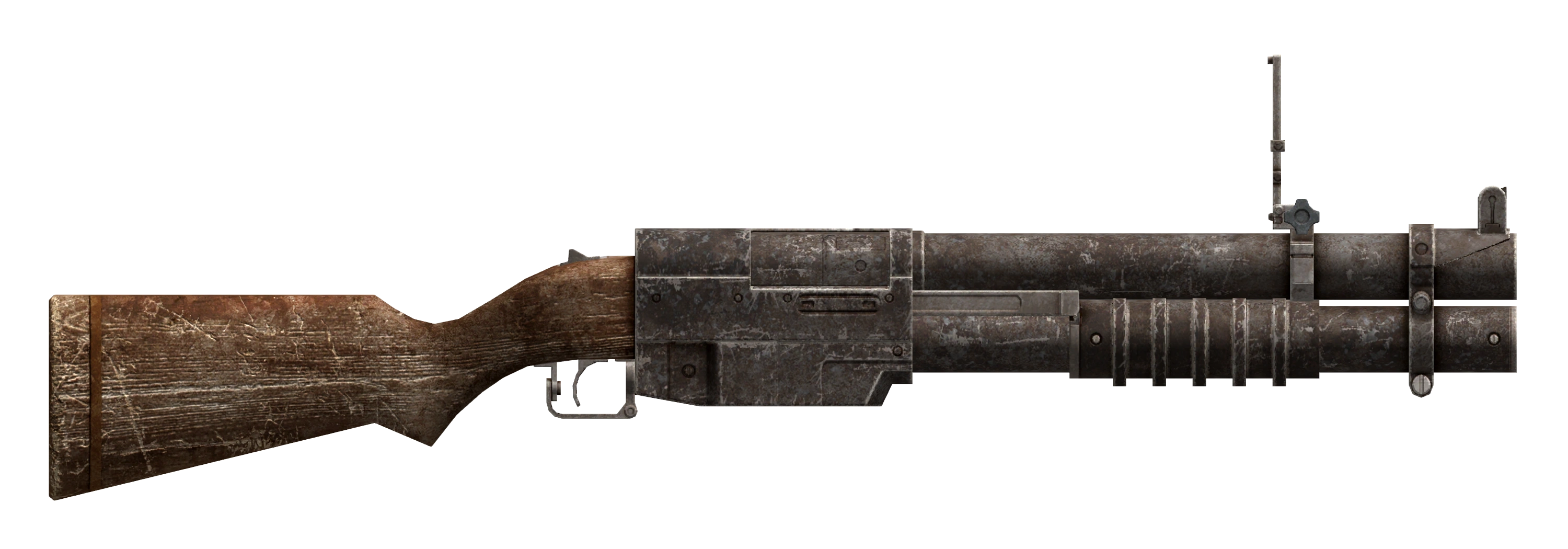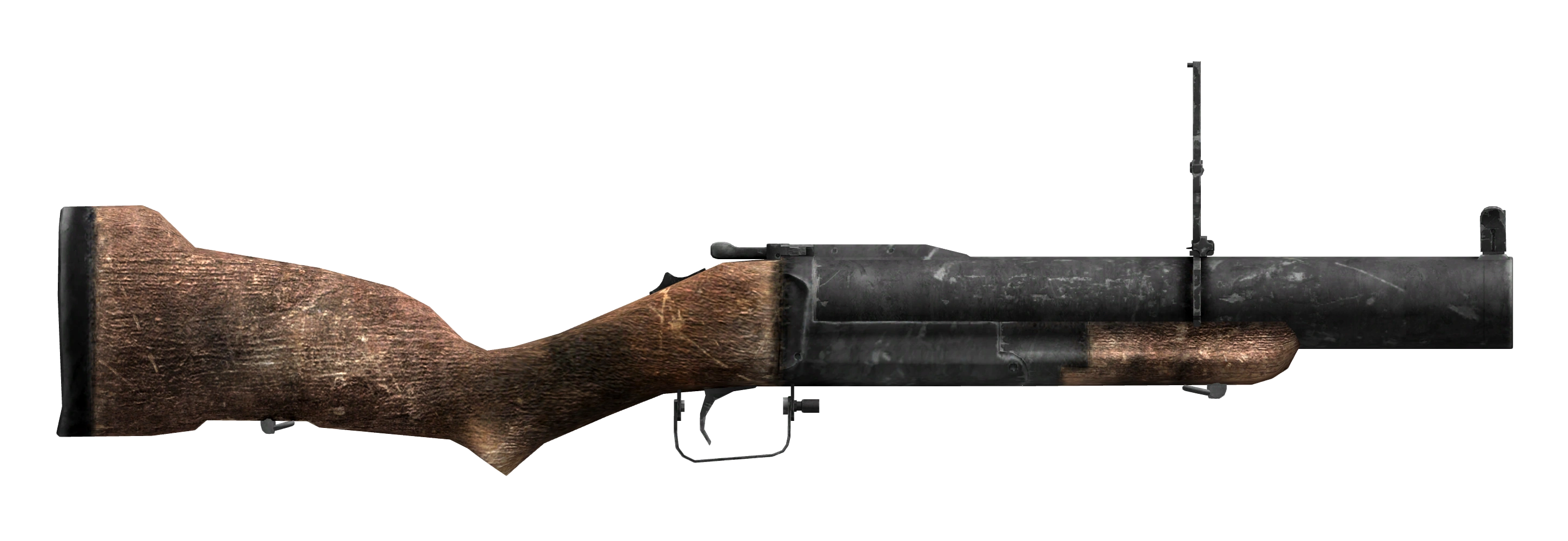 A pump-action weapon with a tubular magazine holding four 40mm grenades, the grenade launcher is an excellent tool for delivering explosives over long distances. Leaf iron sights similar to the grenade rifle are mounted on it. The front sight is a fixed square notch.