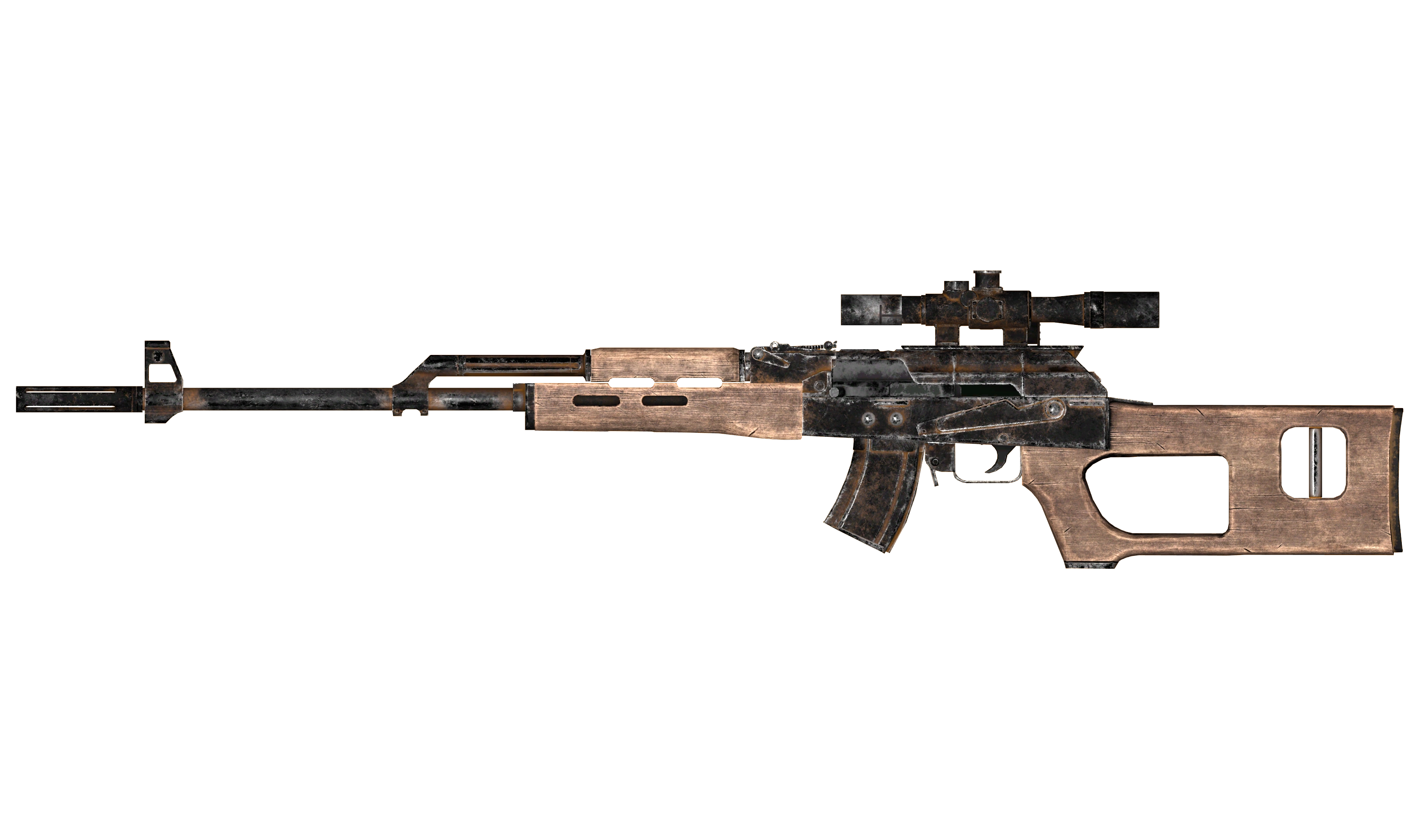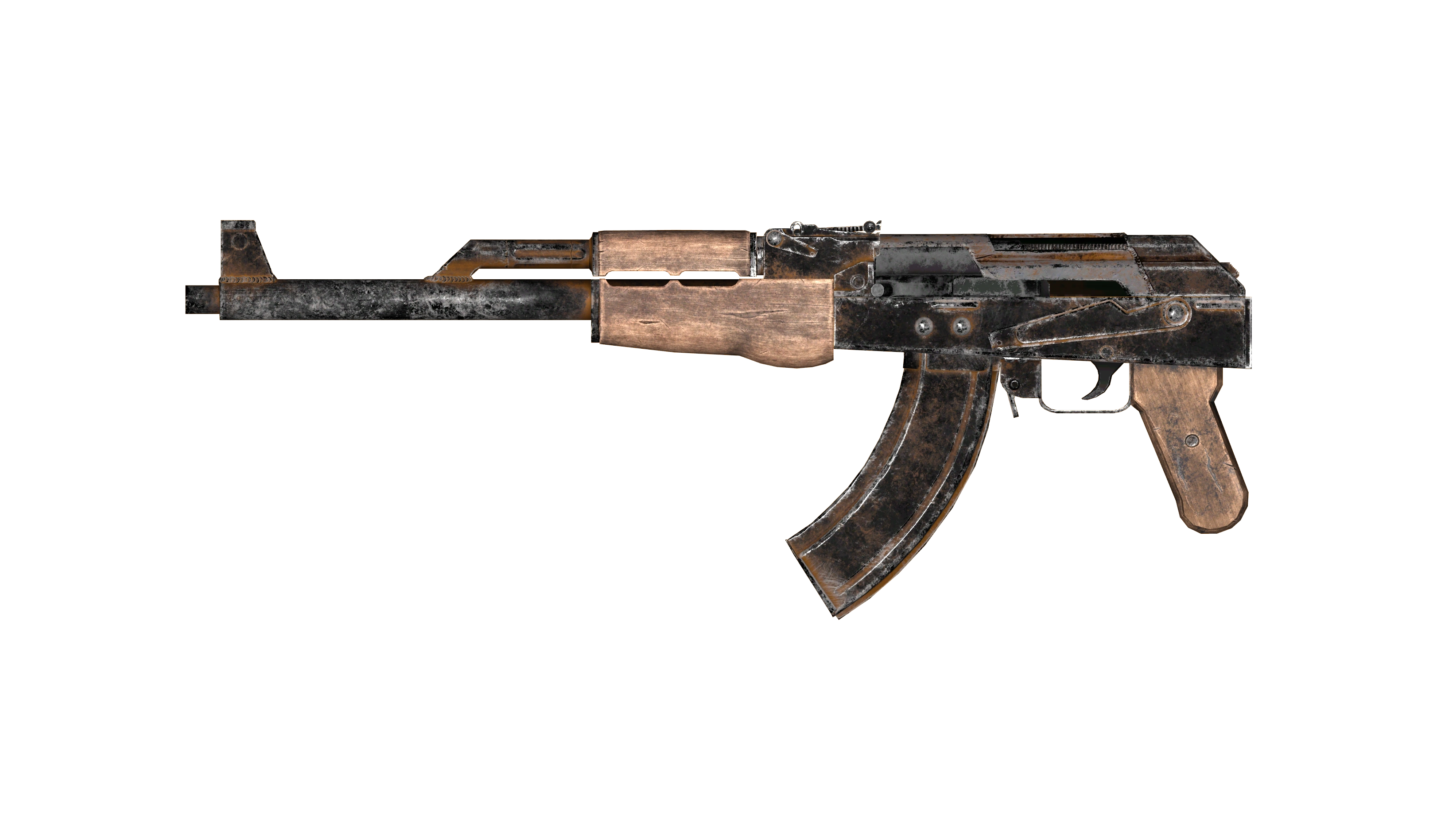 Manufactured by hand by the talented gunsmiths of Nuka-World, this rifle is based on the legendary AK. It is a gas operated rifle with a rotating bolt, whose generous tolerances mean it can be reliably used in the dusty, ruined environments of the post-nuclear wasteland with only a modest amount of maintenance and upkeep. As the staple of Nuka-World raider equipment, there are plenty of modifications available, which allow for tailoring it to suit any mission profile, from close combat assaults to long range sniping and anywhere in between.[1]