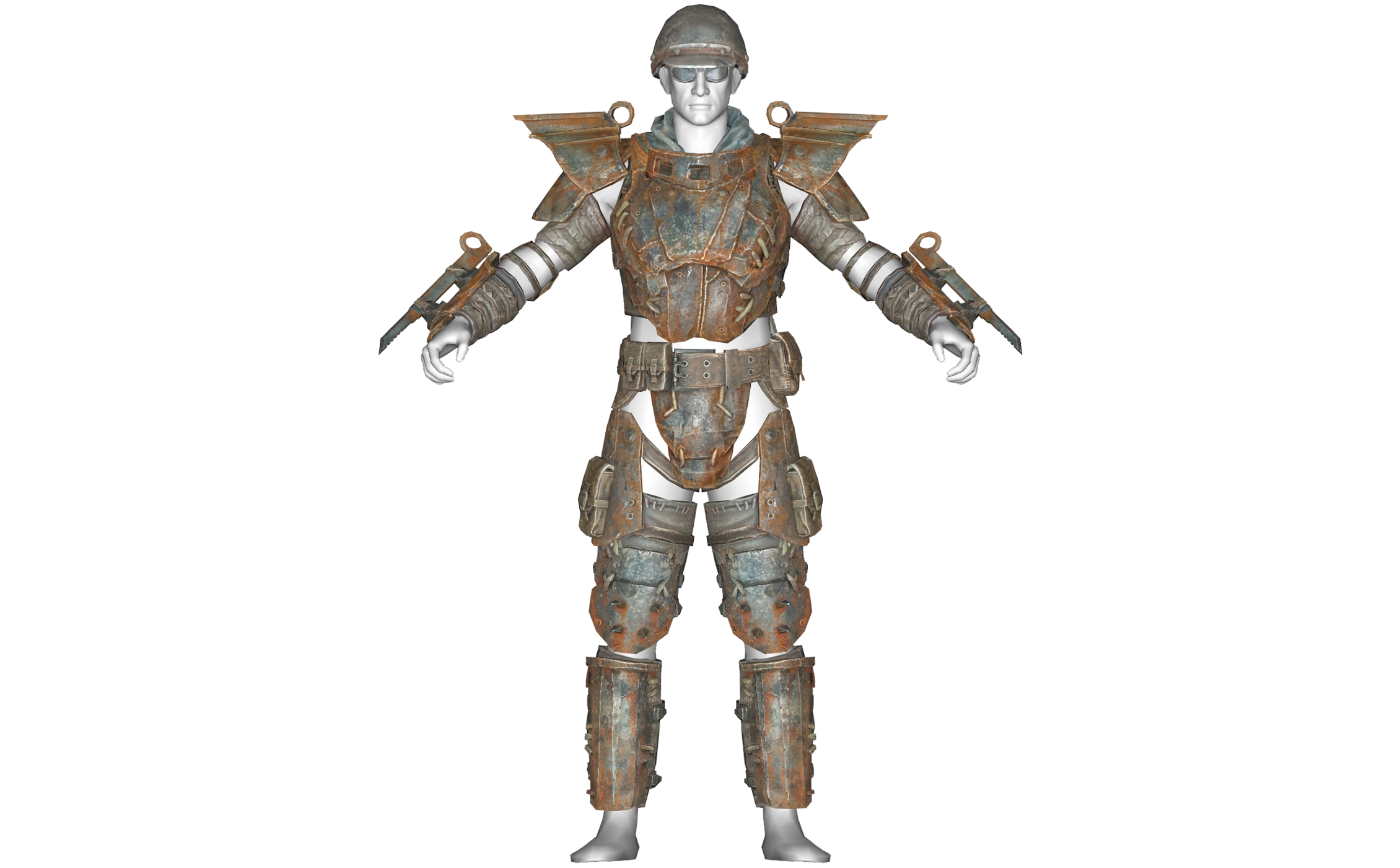 Four joint protectors for the knees and elbows complete the loadout, with four spikes in a square pattern attached on the elbows for that bit of extra grease in bar fights. The heavy variant also features a large utility belt with multiple pockets and additional, oversized plating on the thighs and knees, with more carry pouches bolted onto them. Finally, the armor boasts a large groin protector - or cod piece in some circles.