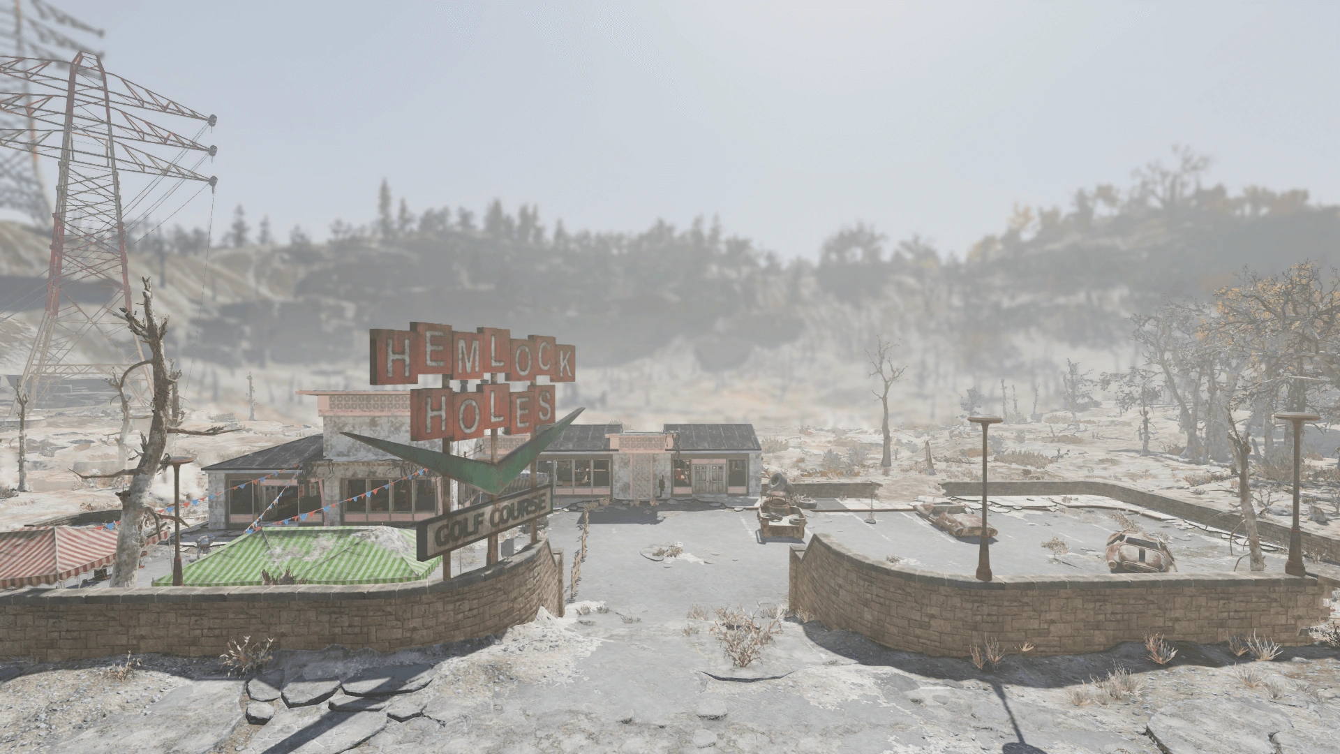 The golf club fell out of use after the Great War, doomed by the pollution spread by Grafton Steel and the absence of time for recreation. A military VB-01 Vertibird has crashed out in the field and was later apparently reclaimed by one of Appalachia's factions.