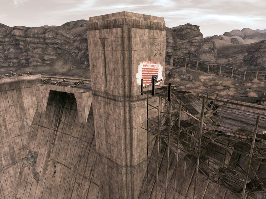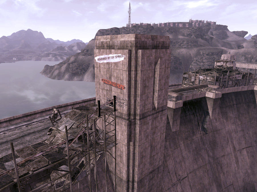 The east side is controlled by the Legion. Going west along the barricaded road leads to the top of the dam itself. Access to Hoover Dam Intake Tower 03 and 04 is via a bridge connected to the north side of the road. There are two towers along the south edge of the road, one ruined.