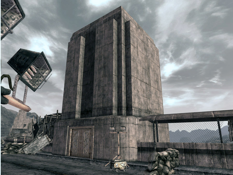 The west side of the dam is controlled by the NCR and features the anti-aircraft gun seen on billboards. The fast-travel map marker puts the player just outside of the entrance to the Hoover Dam Visitor Center. Just north of the visitor center building is a stage and viewing area. To the west of the stage is a large anti-aircraft cannon. Continuing north along the barricaded road leads to the top of the dam itself. Two towers are along the south edge of the road. Access to Hoover Dam Intake Tower 01 and 02 is via a bridge connected to the north side of the road. The road ends at a checkpoint door which is inaccessible until the final quest, such as Eureka!. The checkpoint contains a Very Hard locked terminal, and a few lockers with minor loot. It also houses a small sniper nest on the roof; accessible via a ladder.