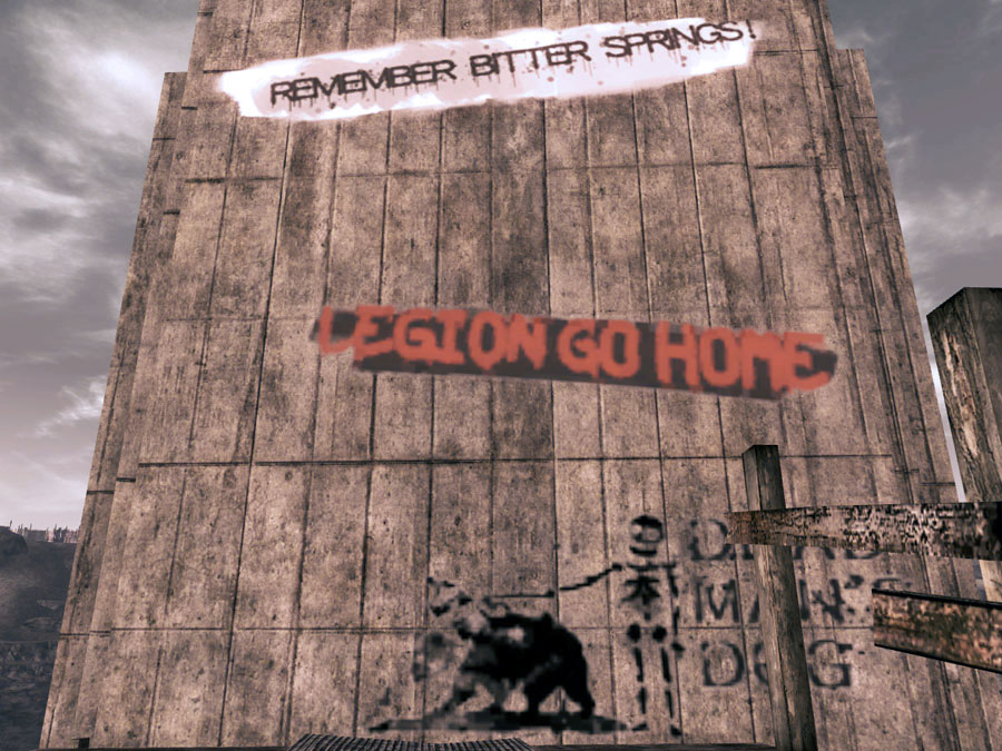 - The graffiti on the Dam towers includes a passage saying LEGION GO HOME, both a propaganda statement and a subtle reference to Life of Brian where Brian writes the same graffiti in poor Latin, earning the wrath of a Roman centurion (it's not actually incorrect in English).