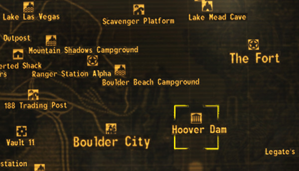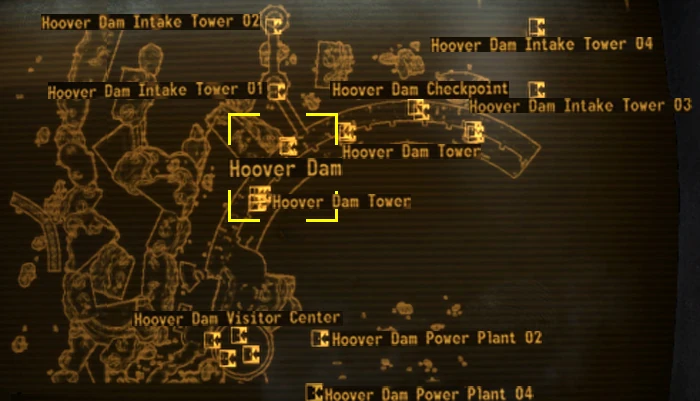 Hoover Dam covers a large area with extensive exterior and interior sections, despite there only being one map marker for the entire location. Following the Colorado River downstream (or coming upstream from Cottonwood Cove) the player will encounter a pontoon barrier presumably to keep the Legion at bay.