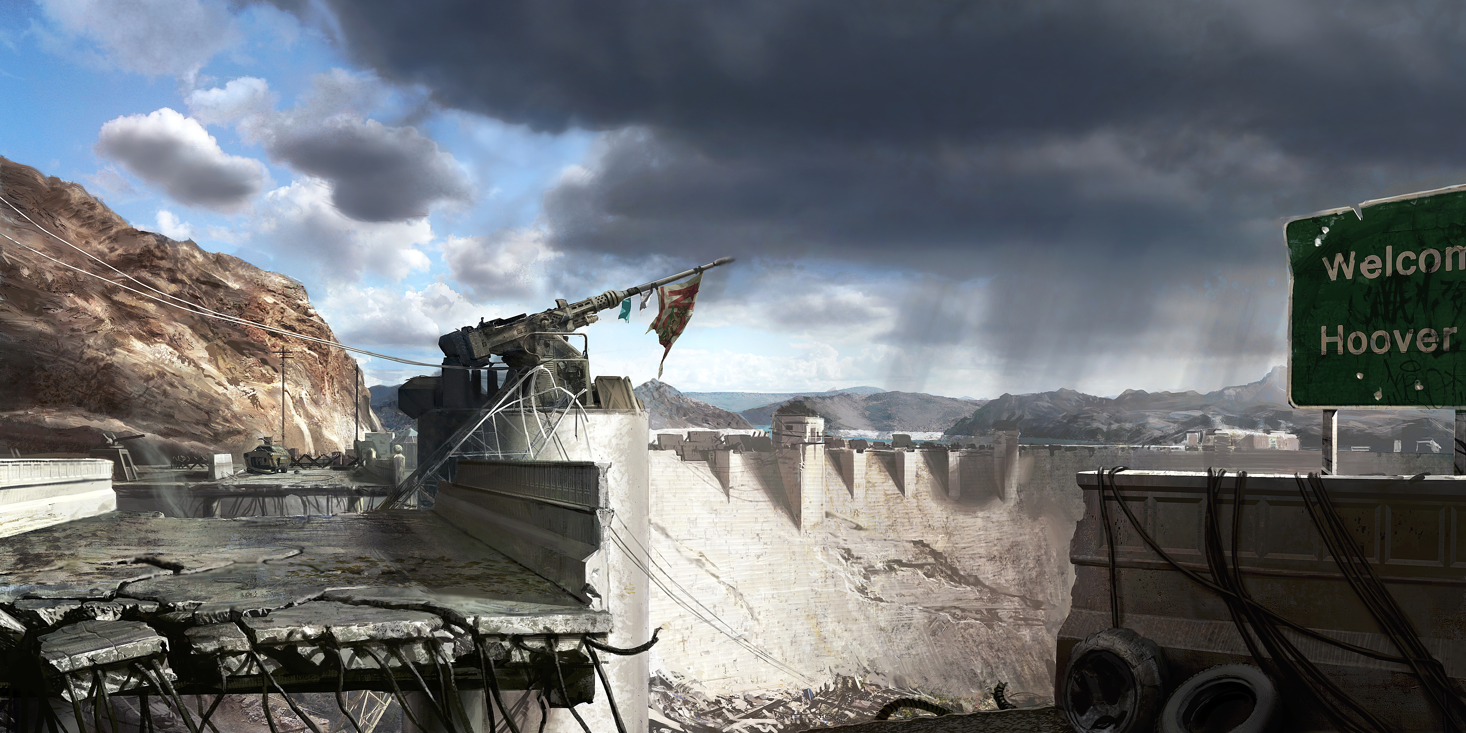 As the resource crisis escalated in the 21st century, the dam was fortified with anti-aircraft weapons to protect against an aerial attack.[1] In 2077, the People's Republic of China attempted to sabotage the Dam. The attack, led by their Crimson Dragoon special forces, was foiled by U.S. forces.[2][3] When the Great War struck, the Dam was abandoned and left to the elements for nearly two centuries.