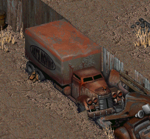 The delivery trucks used by the company appear in Fallout and Fallout 2, parts of the junk wall tileset.