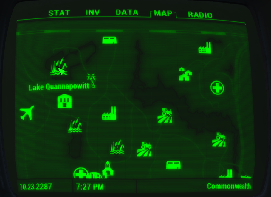 Even before the Great War, Lake Quannapowitt was heavily polluted by radioactive particles and heavy metals; nearby industries (like the General Atomics factory, the Saugus Ironworks, and the Corvega assembly plant) were suspected to be the source.[1] However, it was actually Mass Fusion.[2] The Nahant Oceanological Society verified the Massachusetts Department of Natural Resources' findings[3] and it was urged on June 25 that the mayor of Boston cancel the annual July 4th Bass fishing tournament.[1] (The 2077 tournament being sponsored by General Atomics International as a promotion for their new galleria.[4])