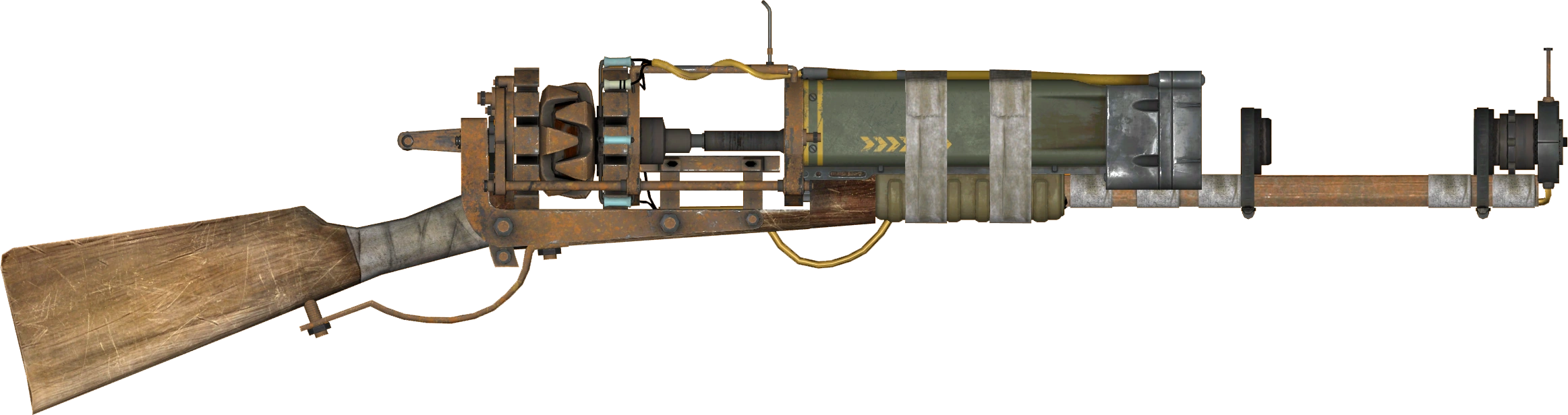 When just giving it one crank, it is essentially a bolt-action laser rifle. The default sights are rather difficult to use, so modifying the sights are a good investment. Furthermore, bracketed barrels allow for the fitting of muzzle modifications. The rifle works best when configured as a long-range sniping rifle, where the player has time to crank it numerous times before firing the first shot, then switch to a different weapon. On the downside, there is no equivalent to a silencer for energy weapons.