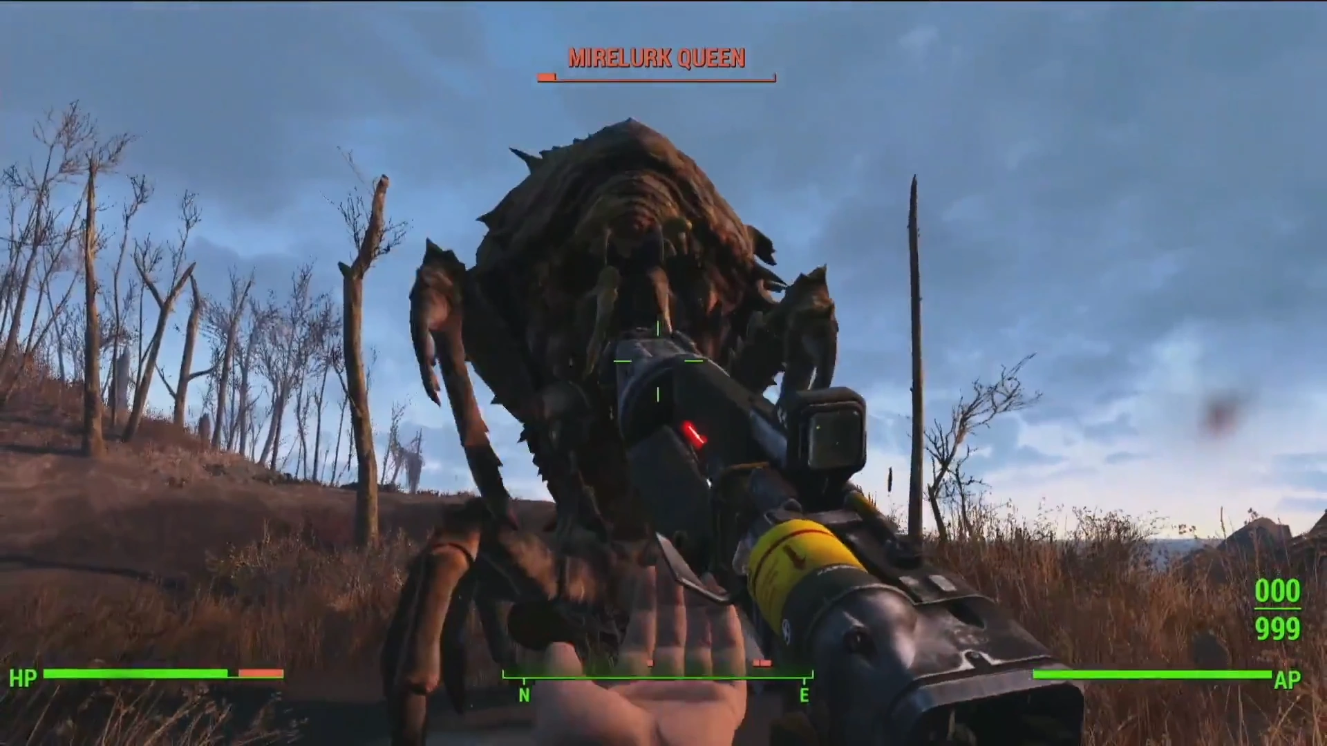 A laser rifle being used against a mirelurk queen in the Fallout 4 E3 demo