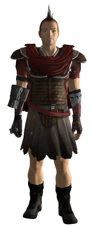This armor has a damage threshold of 12, and can be repaired with any Legion armor. The protective elements of this armor appear to be made of a set of football shoulderpads (protecting the shoulders, neck and chest) and a baseball umpire or catcher's "vest" (protecting the rest of the torso and groin). It is similar to a suit of Legion recruit armor, with the additional of metal bracers on the forearms, as well as a red cloak worn around the neck.