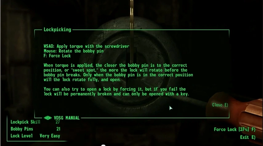The use of lock picks or the expanded lock pick set for mechanical locks, the electronic lock pick or the electronic lock pick Mk II for electronic locks will significantly enhance this skill.This skill can also be used to lock doors, allowing the player to trap enemies in or lock them out of rooms. The first time a lock is picked there is a chance it will jam.