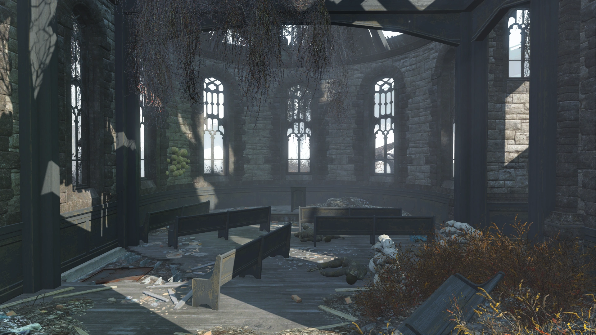 The chapel has seen better days, now littered with skeletons and brain fungus. Among the scattered pews is a hatch that opens to a tunnel leading to the nearby federal ration stockpile. This of course is the reason for the skeletons, both those guarding the hatch and those seeking either the sanctity of the chapel or a way into the stockpile.[1]