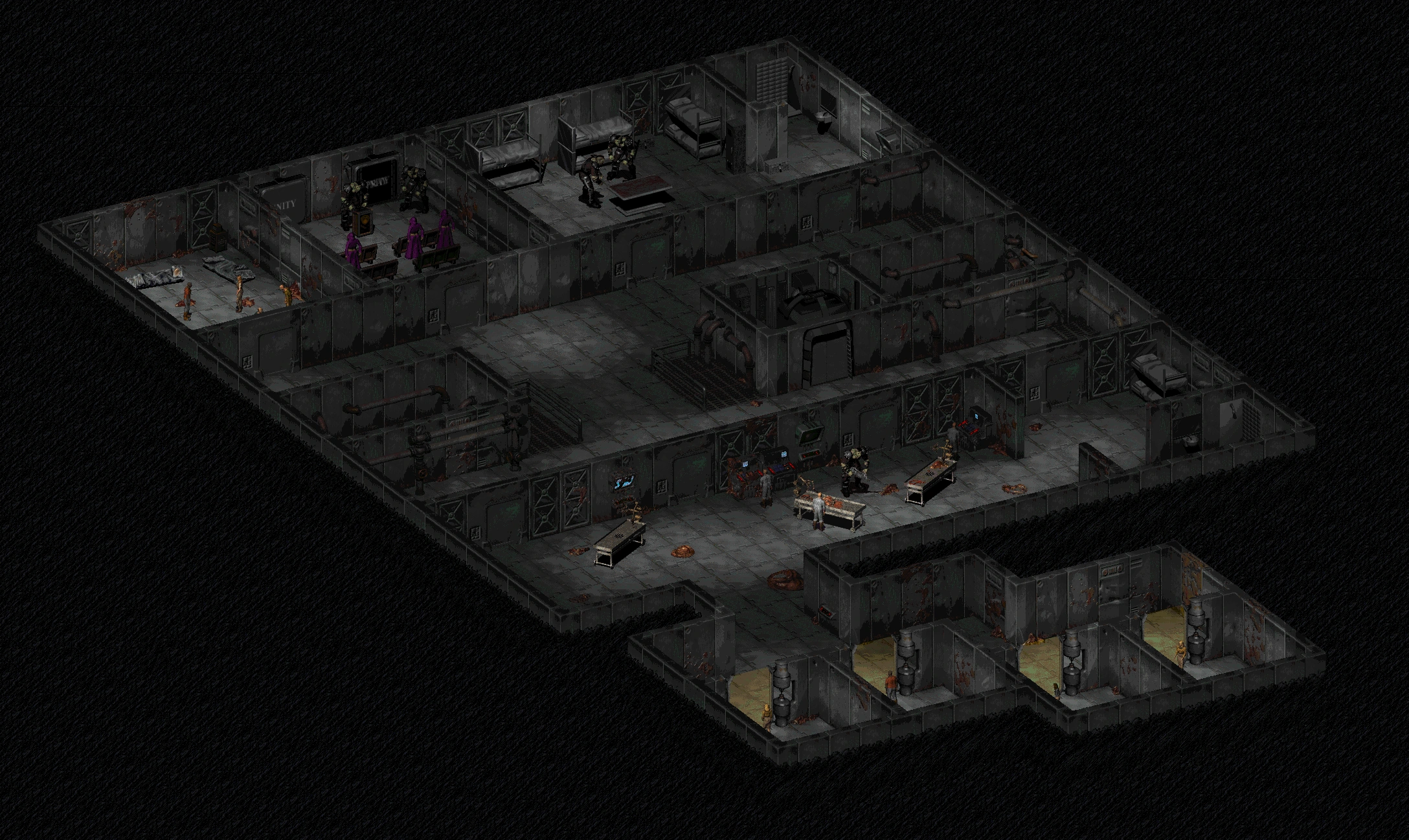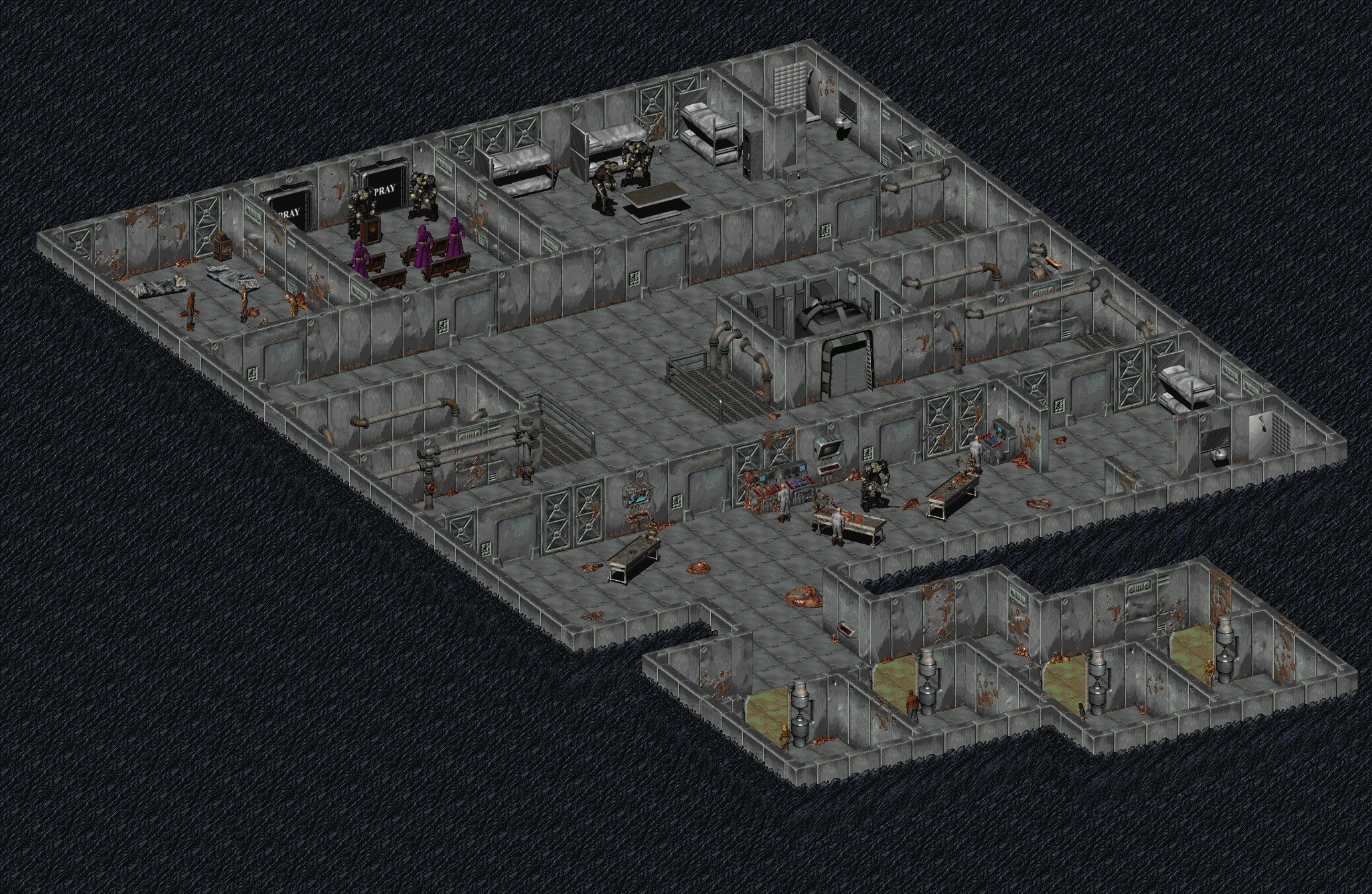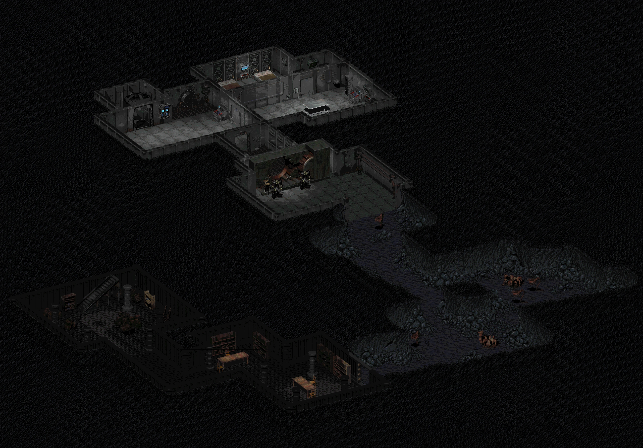 The third level, the command center, also differs markedly in design. Where a meeting room would normally be located is a large robot bay with a four Mr Handys and three Floating Eyes. The storage room and armory are a single room, connecting directly into the command center and security hub. The Master resides in the Overseer's chamber, accessed through a door in the command center. The corridor leading to him is filled with the Master's psionic aura, triggering horrifying hallucinations and injuries to all who dare enter without a psychic nullifier.[3] The library and computer room are absent, replaced by barracks.