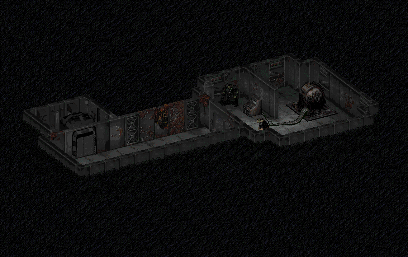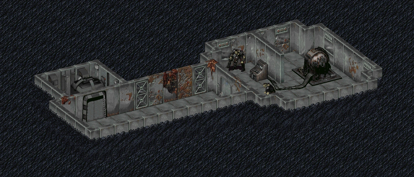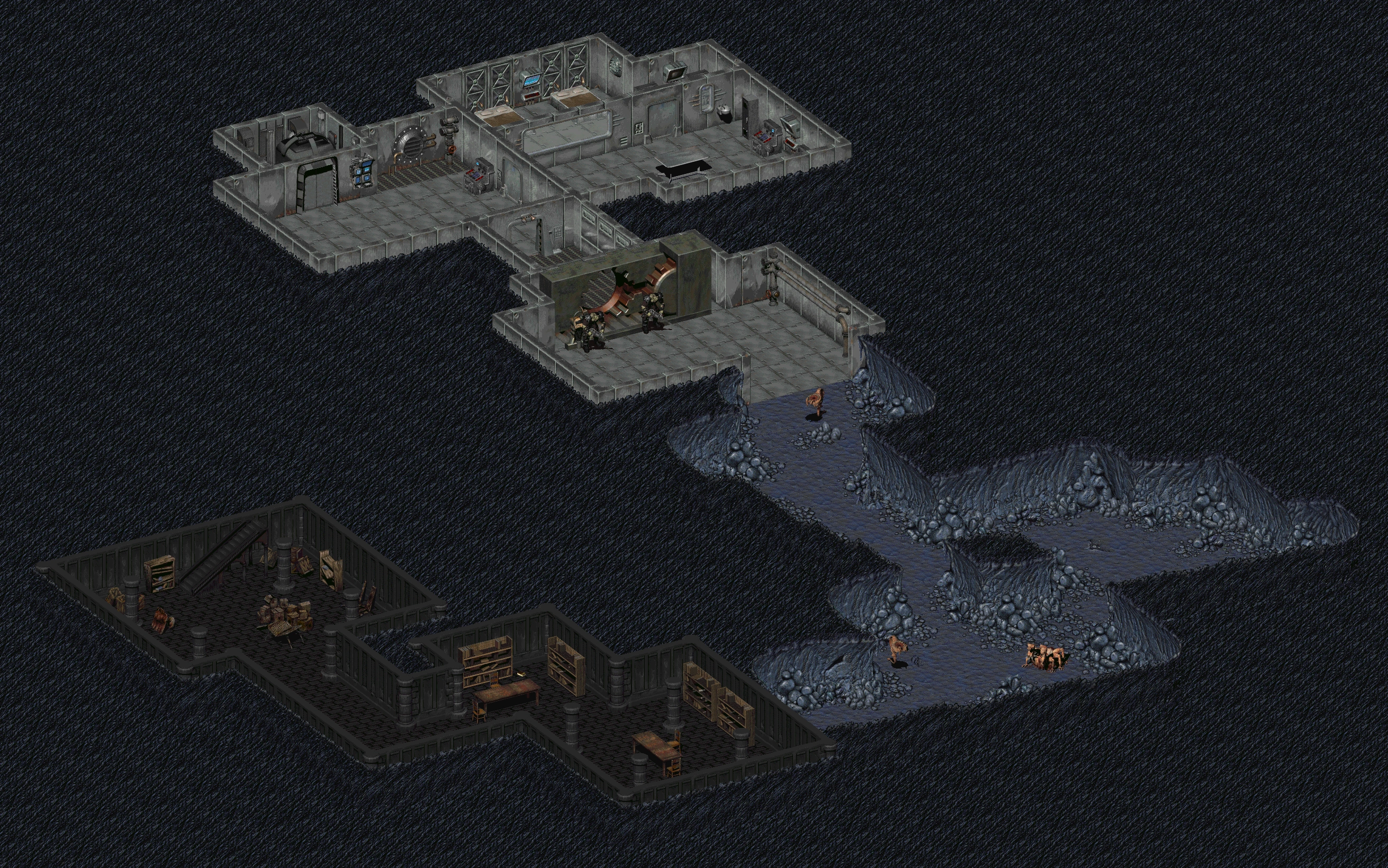 The third level, the command center, also differs markedly in design. Where a meeting room would normally be located is a large robot bay with a four Mr Handys and three Floating Eyes. The storage room and armory are a single room, connecting directly into the command center and security hub. The Master resides in the Overseer's chamber, accessed through a door in the command center. The corridor leading to him is filled with the Master's psionic aura, triggering horrifying hallucinations and injuries to all who dare enter without a psychic nullifier.[3] The library and computer room are absent, replaced by barracks.