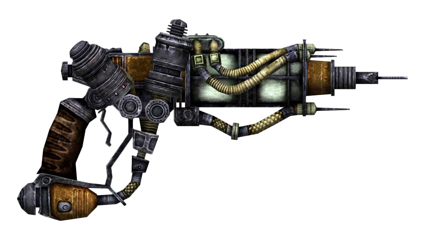 Developed by Doctor Aldwin Morley 14 years before the Great War, as a secretive prototype to the Enclave’s Plasma Pistol, this prototype plasma pistol also proves a conspiracy theory suspected long before the War.[1] At the time, concern was focused on energy cell drain and weight problems caused by the coolant coils, but resulted in the frame being approved and used for the final design.[2] Shortly after, it was stolen from the conspiracy by an organization called Quaere Verum, but was buried in a safe in a desert after being revealed to the Enclave by Morley, who had been posing as a double-agent and allowing the group to steal the Novasurge prototype before prompting Enclave agents to exterminate the group.[3] The pistol was later taken by aliens who, most likely unknowingly brought up both the safe that contained the gun and the computer terminal required to remotely unlock the safe.