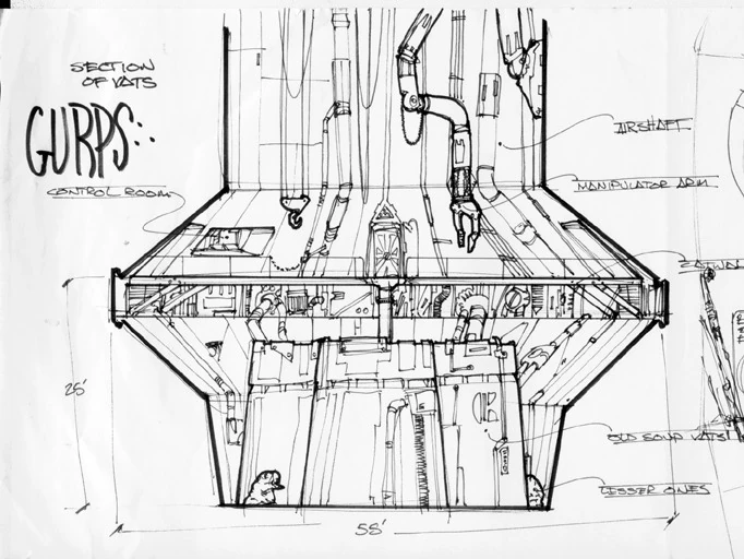 Arguably the heart of the Mariposa Military Base, the deepest level of the installation is built around a central, ventilated chamber housing the vats filled with the Forced Evolutionary Virus alongside a nutrient solution. There are three massive vats, with a catwalk suspended overhead. The large airshaft vents the mutagenic fumes outside through the vent above the entrance. It also doubles as an attachment point for the manipulator arm and crane used to place subjects within the vats for mutation and retrieve them. The Master relied on a crude dipping procedure to create supermutants: Prisoners placed in protective bondage are first rolled into the central area of the catwalk and then an operator uses the crane to lift them up, suspend over the Vat, and then release the subject. The subsequent instant total immersion ensures rapid changes begin to manifest almost immediately.[26] Failed conversions are typically discarded and those that survive will sometimes lurk around the base of the Vats.