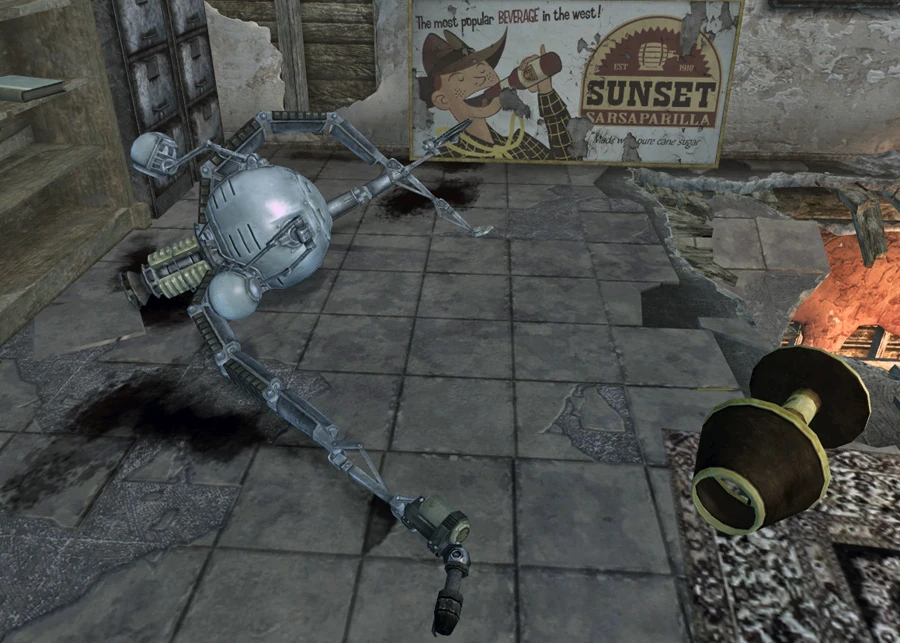 In one of the two factory floors in Sunset Sarsaparilla Headquarters there's one bottling robot who appears to be friendly at first. However, when it discovers the Courier is not a Sunset Sarsaparilla employee, it will turn hostile. On the floor, several broken bottling robots can be looted for some flamer fuel. For security reasons, the Bottling robot will turn hostile towards the player if they are detected attempt to sneak past it.