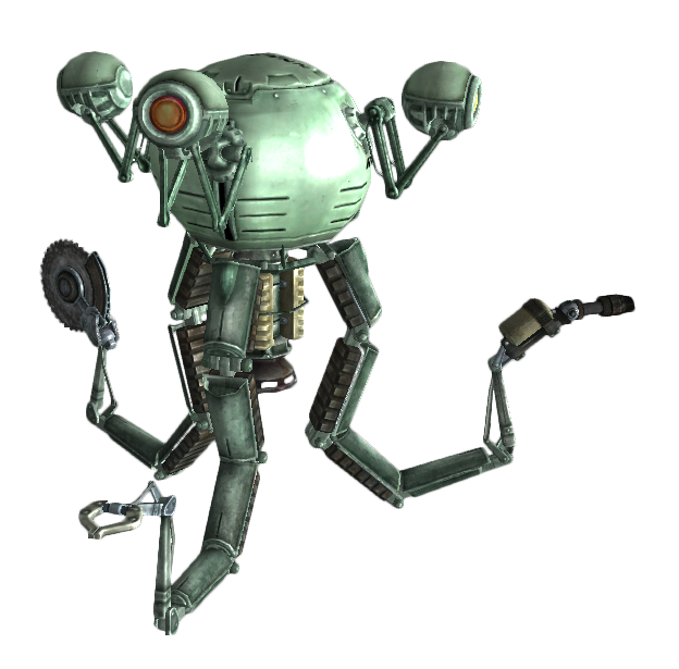 Mister Handies are generally a nuisance to players, but at low levels they can prove to be worthy adversaries. Like all robots, Mister Handies have a combat inhibitor that, when disabled, makes the robot frenzy, attacking anything close to it. Mister Handies are often found in pre-War factories or research facilities.