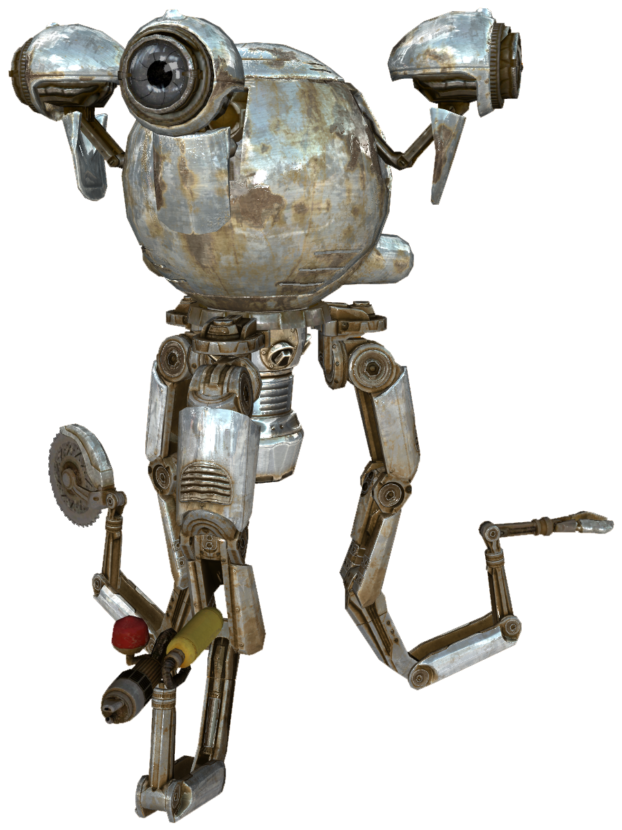 Mister Handys are usually encountered in well established settlements and do menial jobs like janitorial duties and shopkeeping. They only attack if attacked first, and they are not particularly capable opponents anyway, only possessing a single small laser gun. Failing that, they use their simple metal pincers to bash enemies.