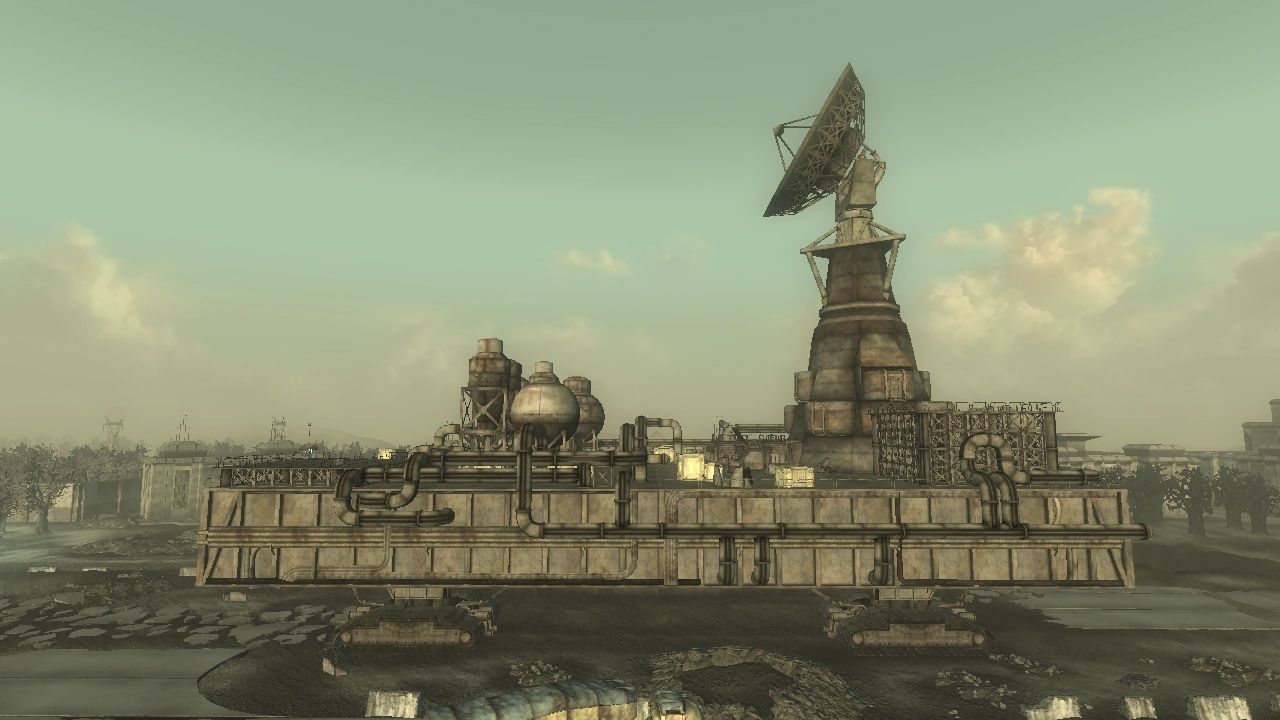 An ancient, pre-War mobile satellite array/space shuttle launch platform carried by a crawler-transporter is the Enclave's backup command center on the East Coast. The massive vehicle was upgraded by the Enclave with newly developed technology, crafting it into a battle-station where the elite Enclave Squad Sigma trains, deathclaw experimentation continues, and access to Earth's remaining orbital payloads (like the Bradley-Hercules) are attempted.[1][2] The amount of technology is so staggering that it would take even a technologically capable organization many years to sift through all of it.[3]